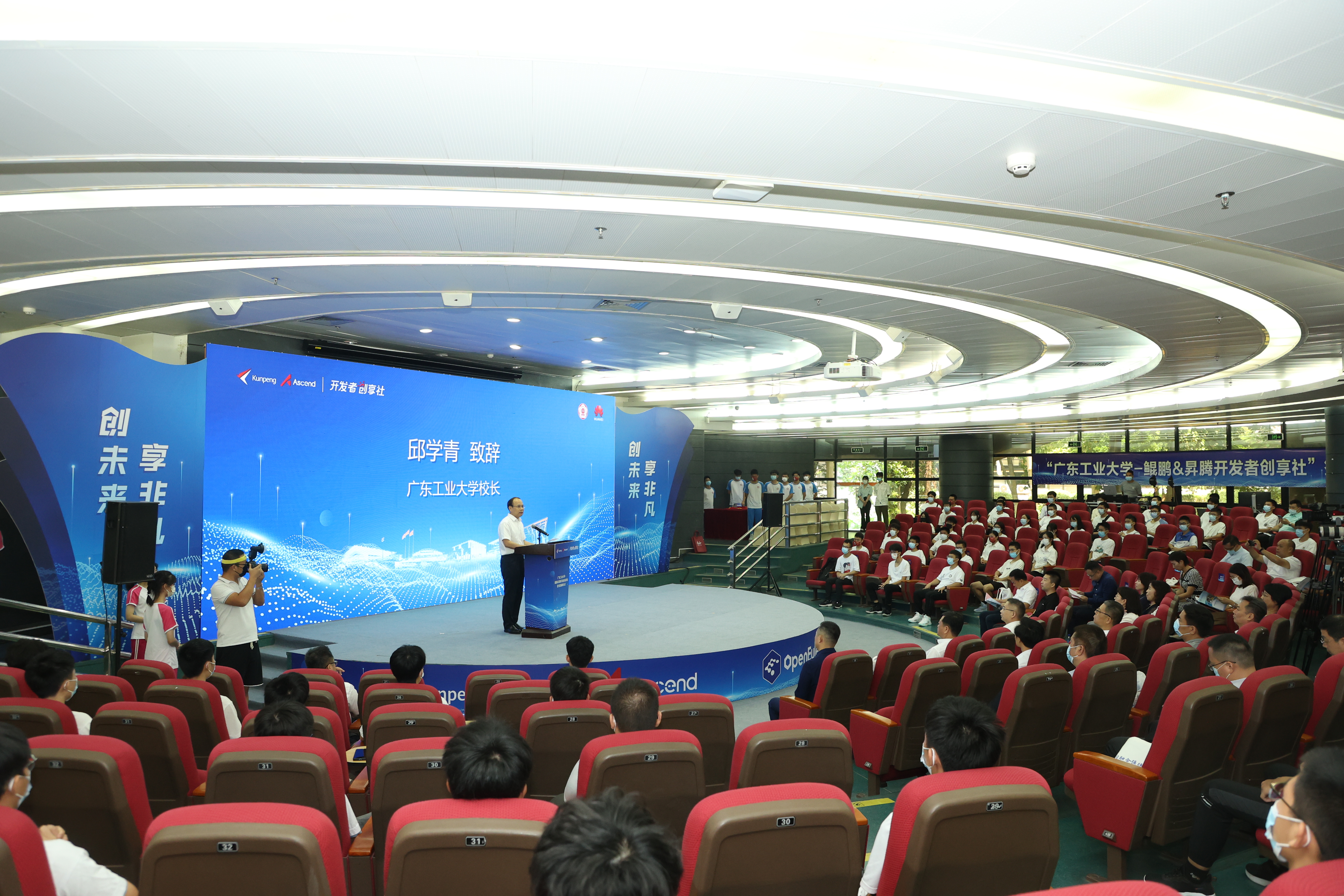 姜涛在致辞中指出,希望与广工一起,围绕鲲鹏、昇腾计算产业根技术,一方面通过“智能基座”合作,将鲲鹏、昇腾产业知识融入理工科培养课程,帮助学生建立系统性的理论知识体系;另一方面,通过创享社合作,使产教融合覆盖更多跨领域融合学科的本科生及硕博人才,加速学生从理论学习向产业实战、研究创新转化。作为创享社合作计划落地的首个高校,姜涛希望广工创享社能成为全国计算产业实践创新的样板示范,以精细化运营组织跨学科、跨年级的多样性实践活动,源源不断孵化出围绕自主根技术的产业创新项目、科研项目,并以新型人才培养方式驱动鲲鹏、昇腾开发者高质量成长。