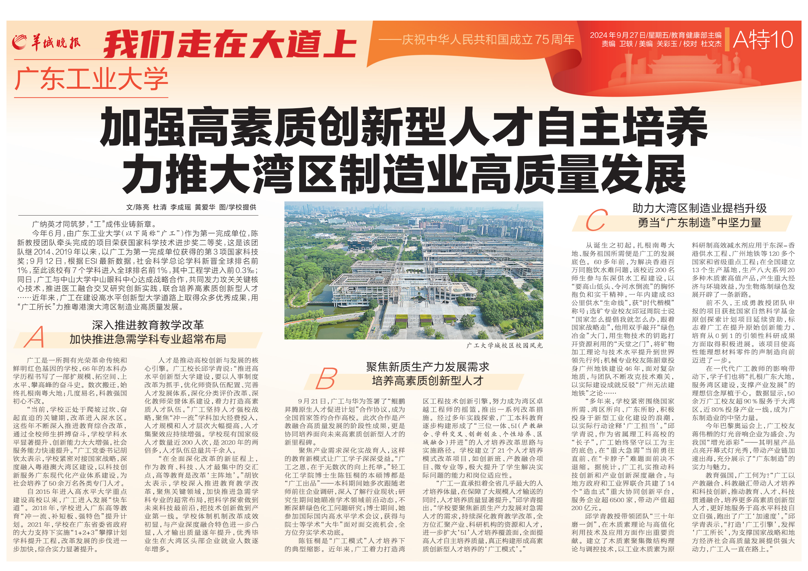 “当前,学校正处于爬坡过坎、奋起直追的关键期,改革进入深水区。这些年不断深入推进教育综合改革,通过全校师生拼搏奋斗,学校学科水平显著提升、创新能力大大增强,社会服务能力快速提升。”广工党委书记胡钦太表示,学校紧密对接国家战略,深度融入粤港澳大湾区建设,以科技创新服务广东现代化产业体系建设,为社会培养了50余万名各类专门人才。