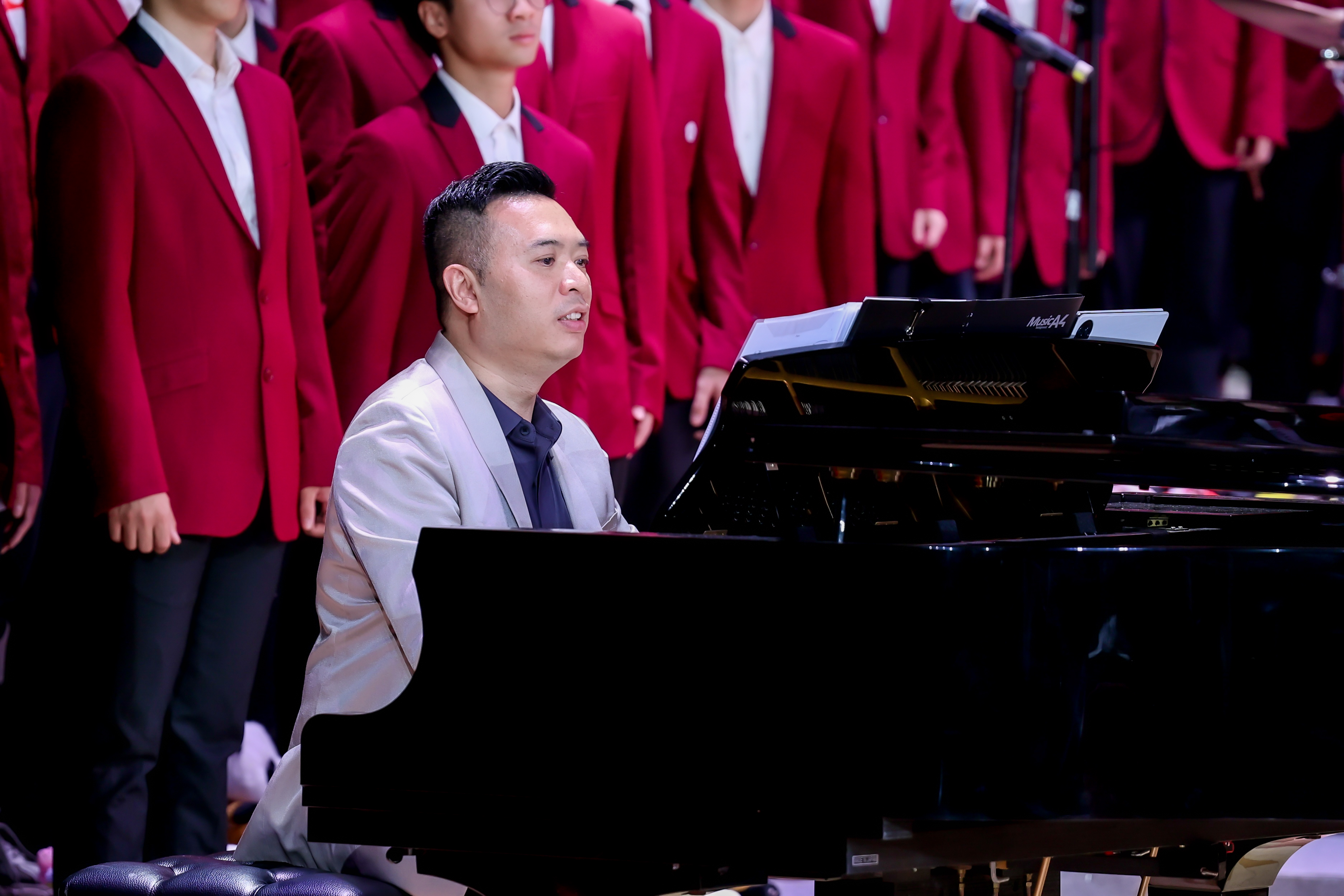 夜幕降临,文化活动中心演艺厅灯光璀璨、座无虚席。校歌《逐梦》拉开了音乐会的序幕。《花好月圆》以其圆润优美的旋律和浓厚的民族特色,象征了团圆、美满与和谐。一曲由广工合唱团演唱的东源县原创音乐作品《歌从山中来》,展现了广工与东源校地融合“双向奔赴”,为“百千万工程”加力提速的精气神。由广工公共艺术教研部教师黄恩旎领唱的曲目《饮酒歌》,以欢快明朗的节奏和热烈的情感表达出新年喜庆的氛围,将音乐会推向高潮。“勇攀高峰,凝心聚力”,曲目《攀撑》以富有变化的旋律描摹了广工发展的点滴历程,高歌了广工砥砺前行、奋勇攀峰的实干精神,展现了广工师生全力加速“冲一流”的精神风貌。