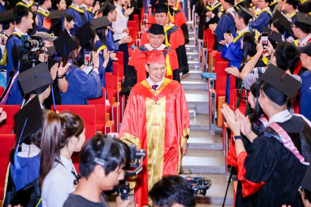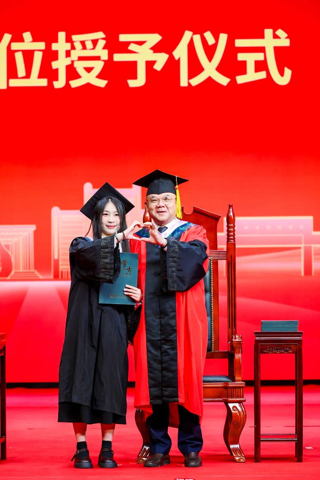 学校学位评定委员会主席、校长邱学青教授,学位评定委员会副主席、副校长杜承铭教授,学位评定委员会副主席、副校长王振友教授,学位评定委员会委员王铁军教授、杨文斌研究员、吴希文教授,教授代表易国斌、周郭许等主礼教授为毕业生代表拨穗、授予学位。随后,毕业生代表向主礼教授们献花致谢。陈卓武主持仪式,杜承铭宣读关于授予博士、硕士、学士学位的决定。