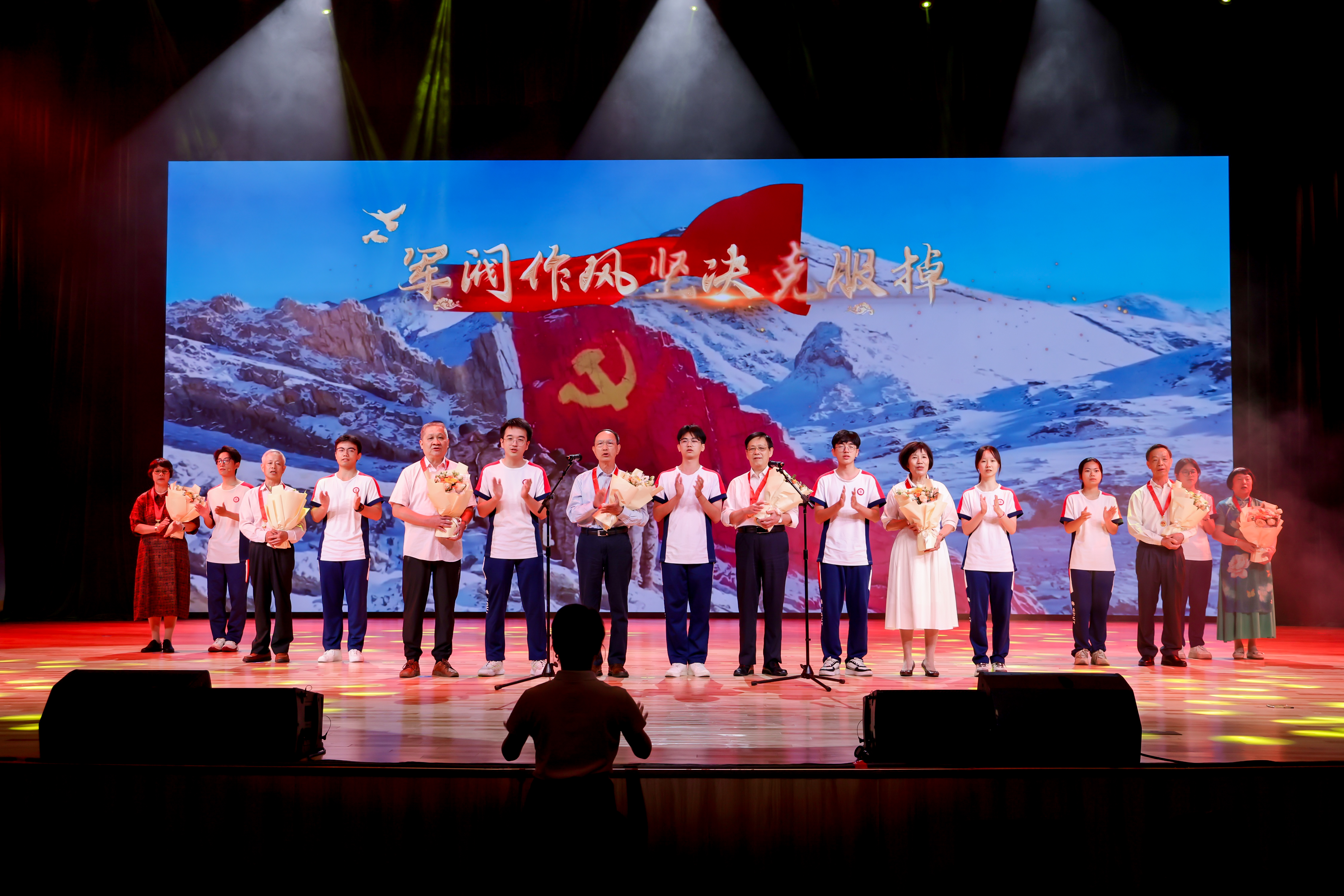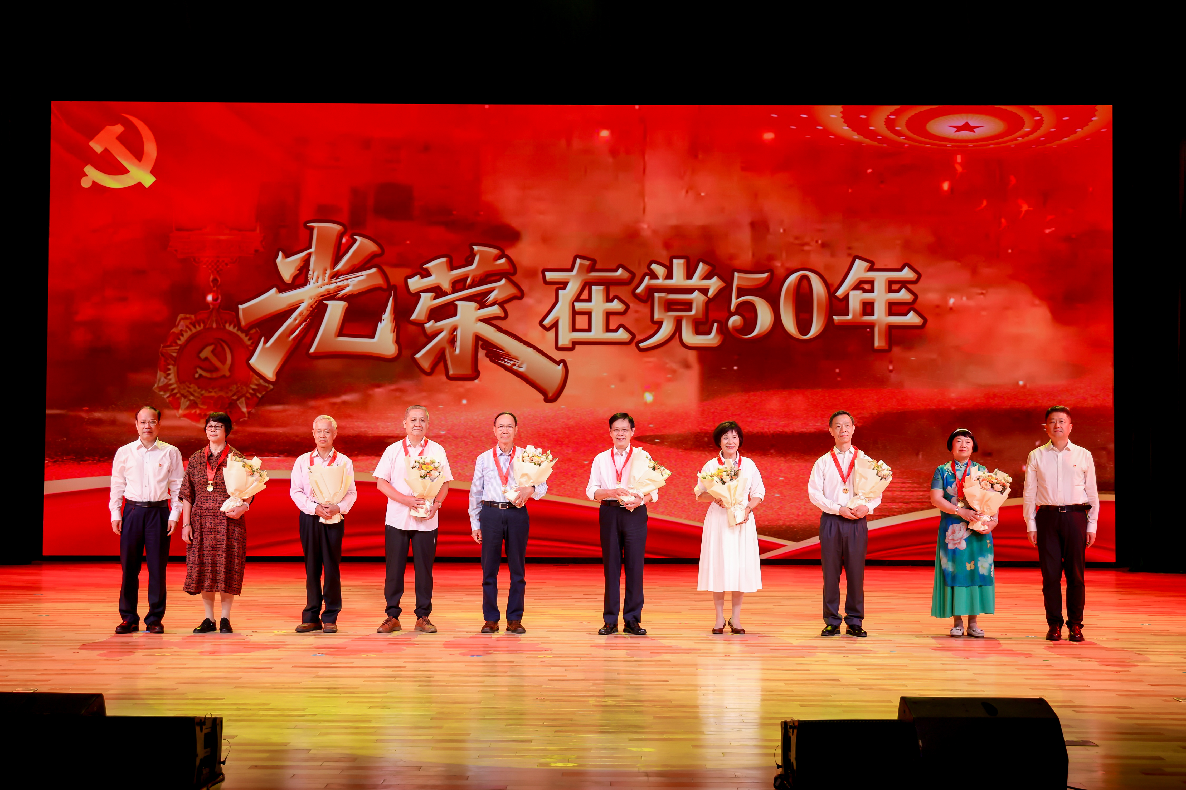 满头白发风霜染,一片丹心映初心。现场,学校党委书记白建刚,党委副书记、校长邱学青为刘大允、黄桂标、符志刚、杜秋虹、肖小亭、庄志强、何芳、韩素珍等8位老党员颁发“光荣在党50年”纪念章,学生党员为他们献上鲜花,致敬他们深厚的爱党情怀和奉献精神。台上台下共唱政治生日歌《三大纪律八项注意》,在歌声中传承优良作风,接好新时代党的接力棒。