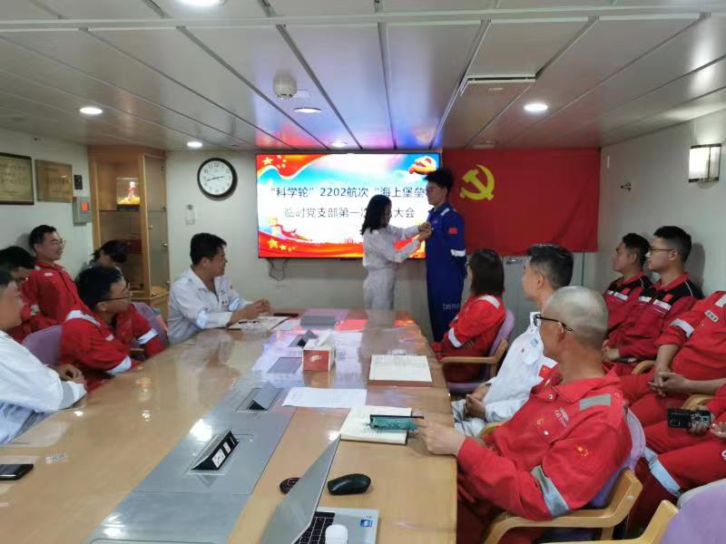 据悉,“科学”轮2022航次第一航段“海上堡垒”临时党支部由来自万搏网页_万搏(中国)生态环境与资源学院和中国科学院海洋研究所、南方海洋科学与工程广东省实验室(广州)、浙江大学、华洋海事、中海辉顾等单位的30名中共党员和入党积极分子组成,其中广工师生党员10名。国家重点研发计划青年科学家项目首席教授、国家优青、广工生态环境与资源学院博士生导师冯景春教授担任2022年夏季我国冷泉航次首席科学家,负责整个科学考察期间作业任务的制定和作业计划的具体实施,负责科研人员与船队人员的沟通和任务衔接。同时,临时党支部组织开展了“带党徽、亮身份”活动,冯景春教授担任临时党支部纪检委员,为新上船党员颁发并佩戴党徽,激励全体党员在航次任务中充分挥临时党支部战斗堡垒作用及党员先锋模范作用。