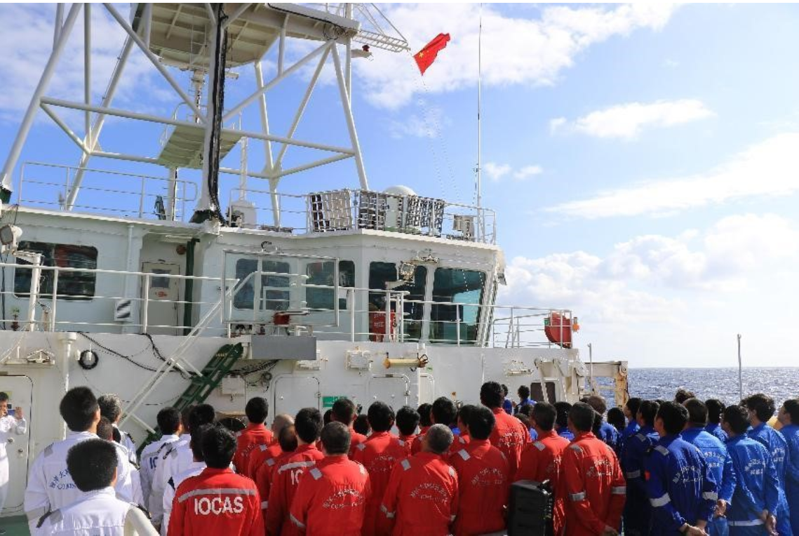 活动在庄严的升旗仪式中拉开序幕,全体人员齐聚甲板,由万搏网页_万搏(中国)生态环境与资源学院教授、航次首席科学家冯景春同志为升旗手授旗,伴随着庄严的中华人民共和国国歌,五星红旗在南海上空冉冉升起,随风飘扬,全体人员向国旗行注目礼,共唱国歌,以这种庄严神圣的方式向党的101岁生日致敬献礼。