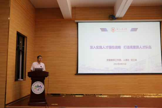 学校人事处处长刘三林作了题为《深入实施人才强校战略,打造高素质人才队伍》的报告,从人才工作的政策背景、学校人才队伍建设规划、学校人才队伍建设情况、以制度创新推动人才队伍新发展四个方面进行深入阐述。学校以“人才强校”发展战略为引领,以人事管理制度建设为抓手,补齐人事管理制度的空白,强化人事管理制度的短板,深化人事制度改革,努力营造“人尽其才,才尽其用”的良好氛围,支持青年人才挑大梁、当主角,激发广大教师干事创业的内生动力,激励优秀人才脱颖而出、发挥作用,打造支撑“1+2+3”攀撑工程的高素质师资队伍。