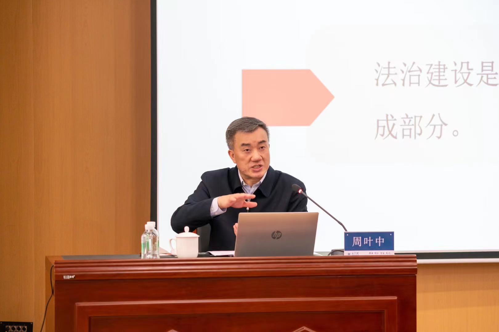 周叶中围绕“习近平法治思想是全面建设社会主义现代化国家的行动指南”“系统把握习近平法治思想的主要内容”“以习近平法治思想为指导,完善保障社会主义现代化建设的法治体系”三个部分,从战略、理论和实践多重维度,重点阐释、深刻分析了习近平法治思想中的“十一个坚持”及其重大原创性贡献。报告会内容丰富、观点鲜明、视野开阔、说理透彻,政治性与理论性并重,为师生们进一步理解法治与中国式现代化的互动关系、习近平法治思想的重大意义等问题提供了世界观和方法论。现场师生反响热烈。