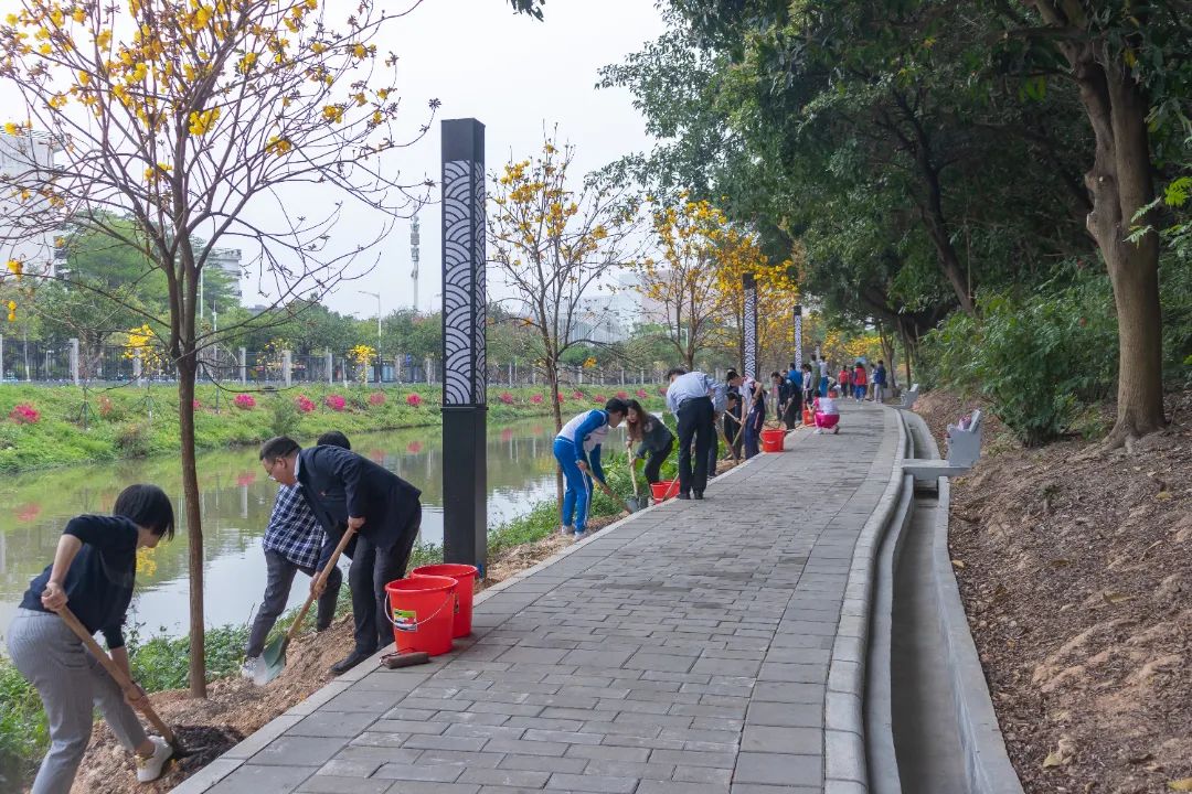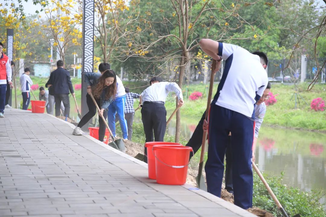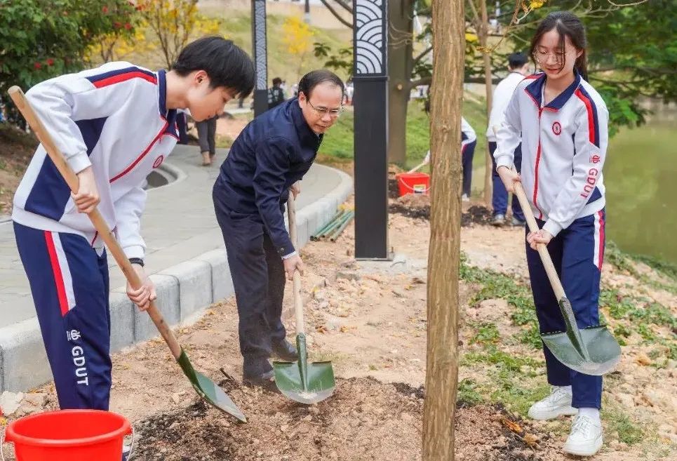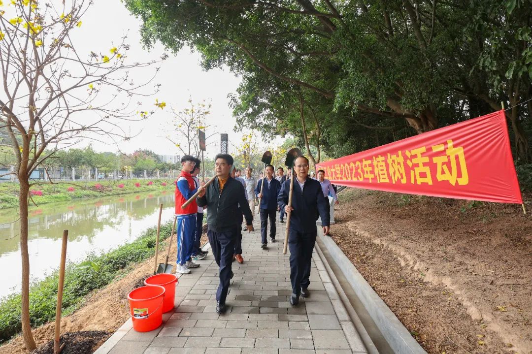 山黛满目,春生万物。3月13日下午,学校在大学城校区生活西区河涌两岸开展了“喜迎校庆,捐植树木,美化校园”植树活动。学校党委书记胡钦太,党委副书记、校长邱学青,党委副书记陈良友,党委常委、副校长杜承铭,党委常委、副校长陈卓武,党委常委、副校长栾天罡,副校长余林,党委常委、副校级干部张学理,各相关单位、部门负责人,大学城校区各学院师生代表、学生志愿者等,分别组成27个植树小组为校园增添新绿。