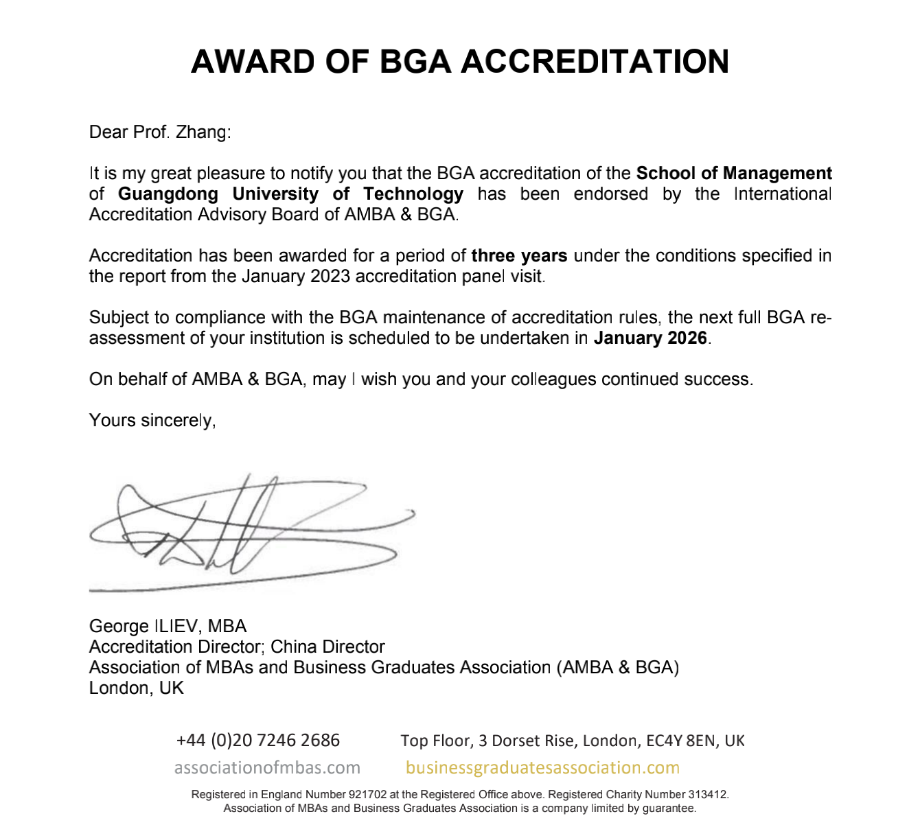 4月19日,学校管理学院收到英国商学院毕业生协会(Business Graduates Association,简称BGA,是全球商学教育三大认证体系之一)发来的官方贺信,祝贺管理学院顺利通过BGA国际金牌认证,成为广东省首个单独获得BGA金牌国际认证的商学院,同时学校也获得首个国际商科认证。