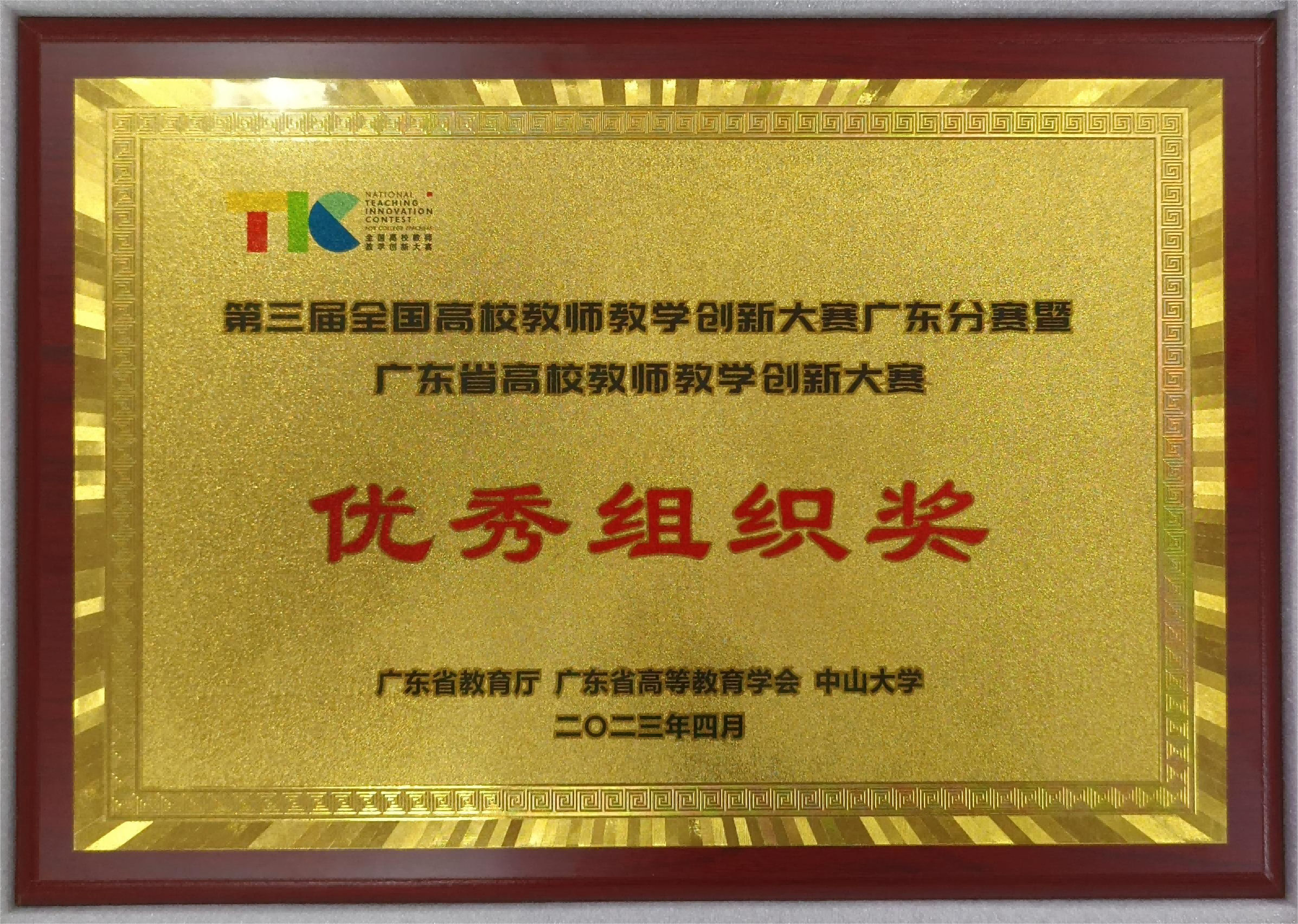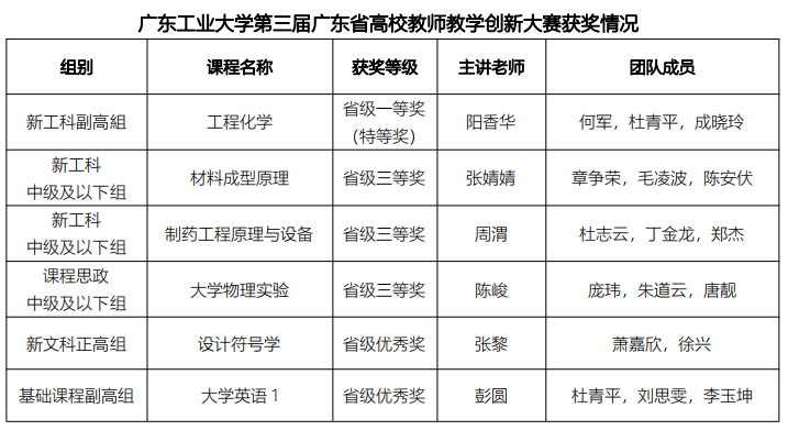 2022年11月-2023年4月,第三届全国高校教师教学创新大赛广东分赛暨广东省高校教师教学创新大赛举行。广工轻工化工学院阳香华教师团队荣获一等奖(特等奖),并将代表广东省参加第三届全国高校教师教学创新大赛;材料与能源学院张婧婧教师团队、生物医药学院周渭教师团队、实验教学部陈峻教师团队荣获三等奖。同时,广工获颁第三届广东省高校教师教学创新大赛“优秀组织奖”。