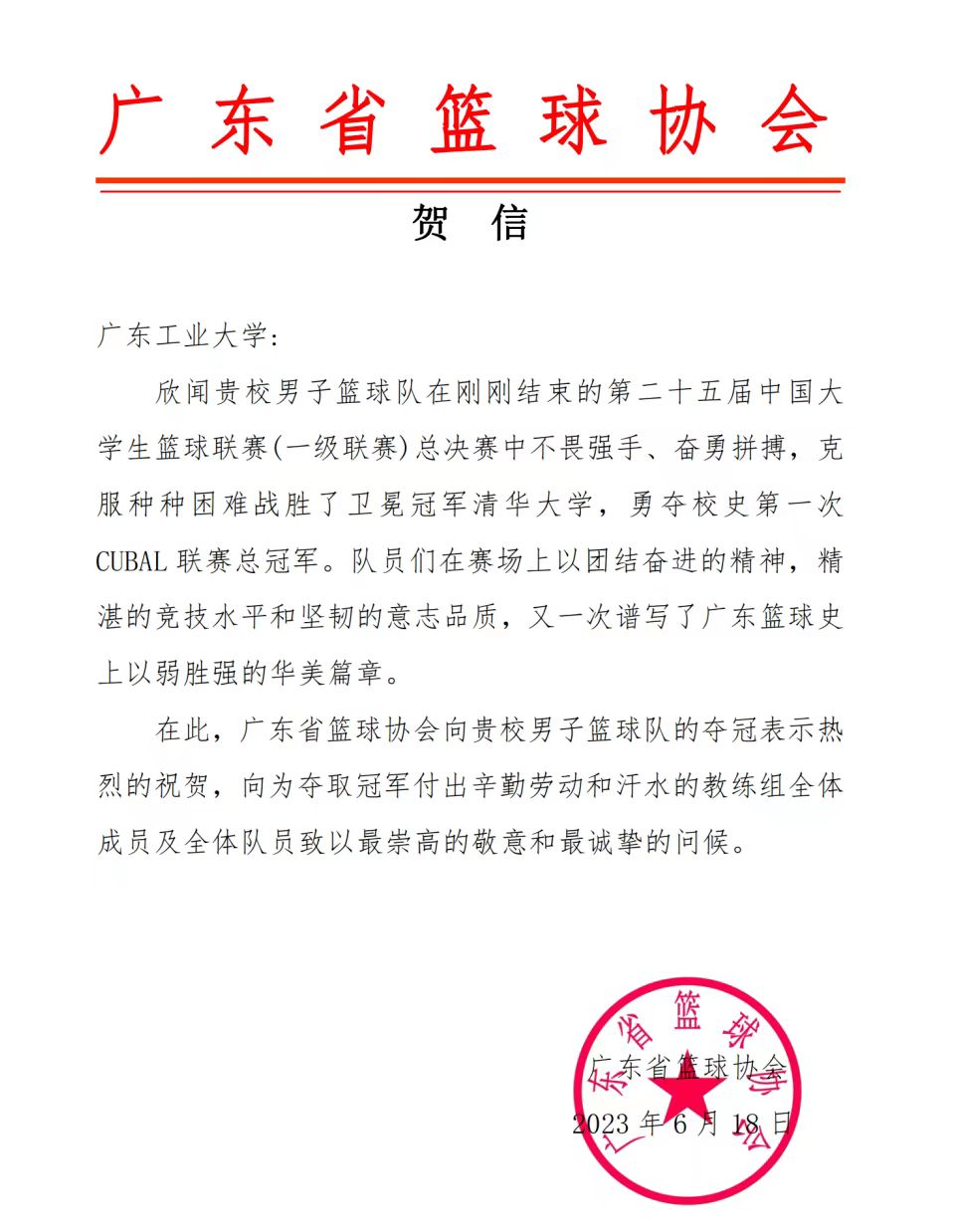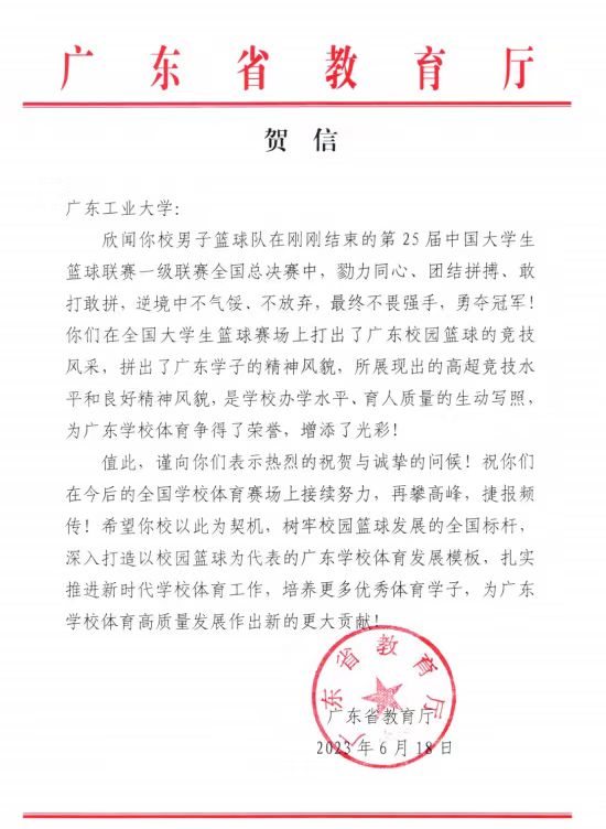 在刚刚结束的第25届中国大学生篮球联赛一级联赛全国总决赛中,我校男子篮球队南粤雄狮勇夺冠军。省委主题教育第十七巡回指导组、广东省教育厅、广东省篮球协会纷纷发来贺信表达祝贺和问候,贺信中对我校一直以来坚持为党育人、为国育才,坚持立德树人、特色办学,教育质量和水平不断提升给予充分肯定。广工男篮在比赛中团结拼搏、永不言弃,展现了万搏网页_万搏(中国)学子新时代敢于拼搏、勇于挑战的精神风貌,打出了广东校园篮球的竞技风采,谱写了广东篮球史上以弱胜强的华美篇章。