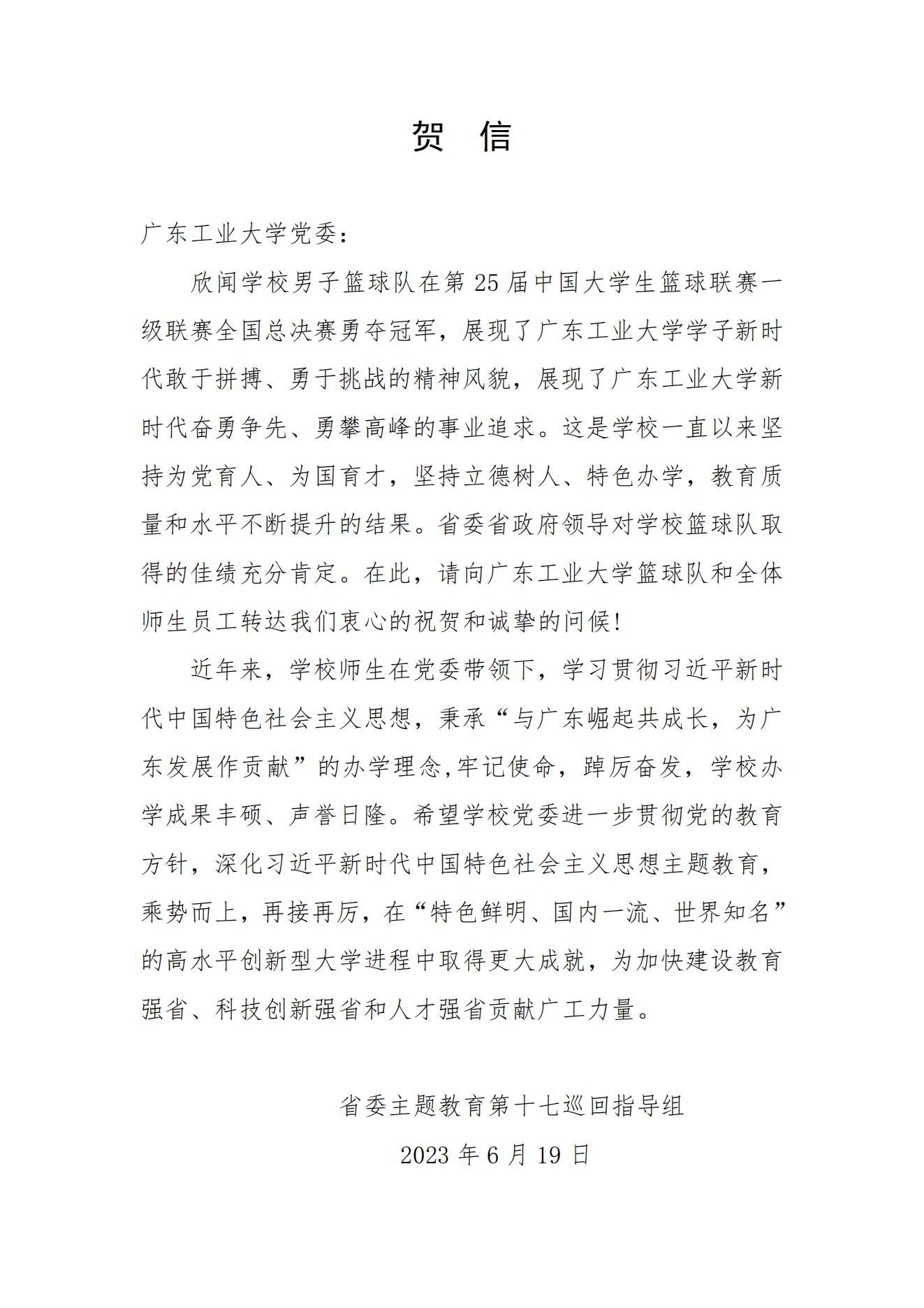 接下来,学校将贯彻落实好贺信精神,在省委主题教育第十七巡回指导组的指导下,深化习近平新时代中国特色社会主义思想主题教育,乘势而上,再接再厉,为加快建设教育强省、科技创新强省和人才强省贡献广工力量。