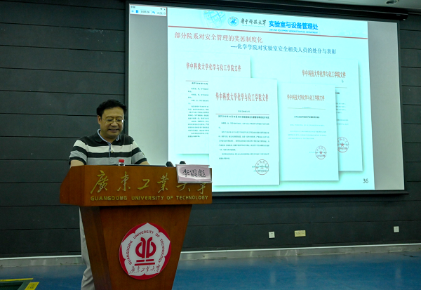 下午,华中科技大学实验室与设备管理处处长李震彪教授作主题为《青春无限好 安全日月长》的报告,通过一件件鲜活案例,以风趣幽默的语言与师生解析事故责任判断的依据,强调有安全才有未来,不顾及、不重视安全的实验工作,就等于“谋财害命、违法犯罪”。并毫无保留地将华中科大在实验室安全管理方面的工作经验向广工倾囊相授,助力兄弟高校实验室安全管理能力和水平的提升。