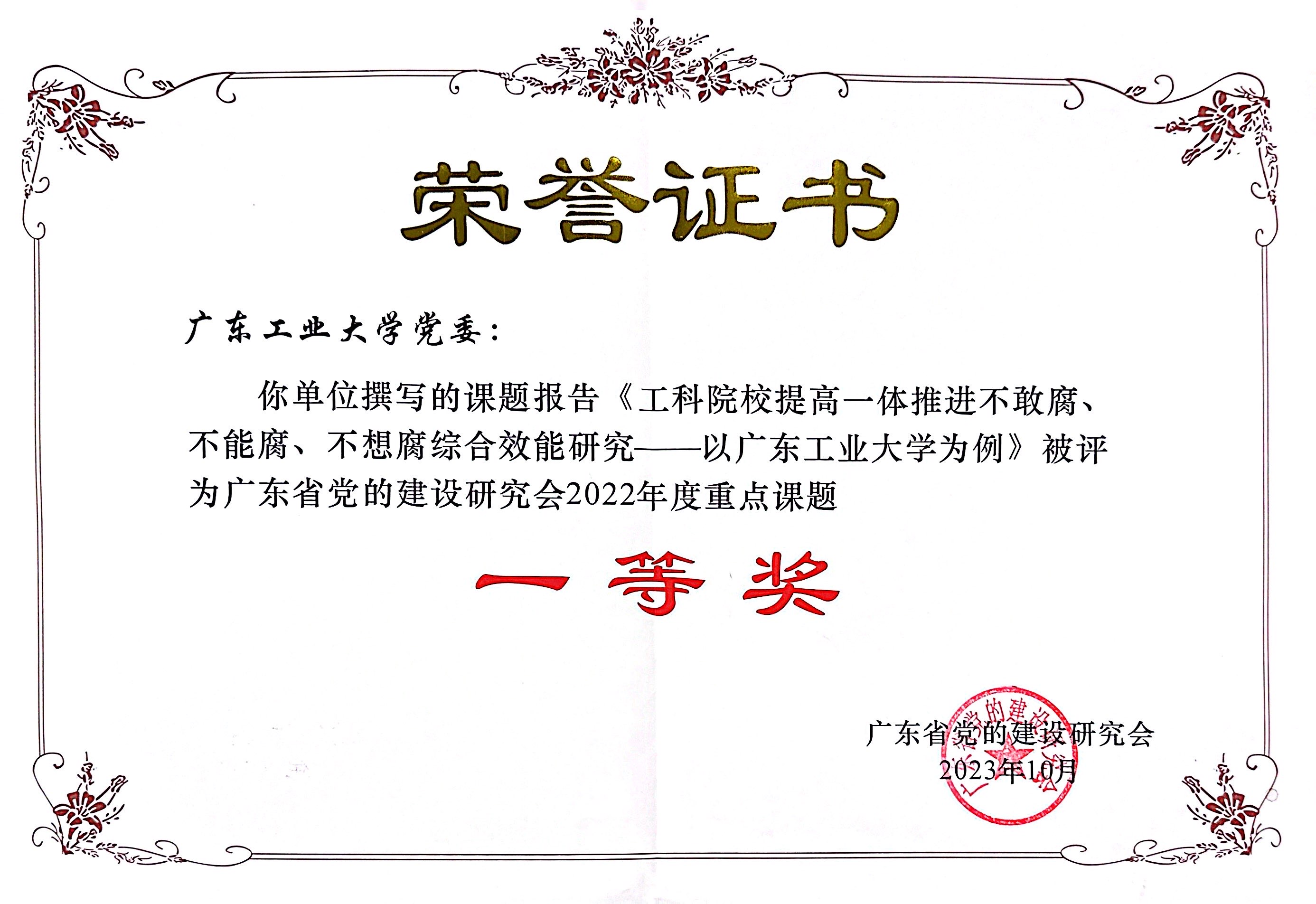 近日,广东省党的建设研究会公布2022年度重点调研课题优秀成果,学校党委撰写的课题调研报告《工科院校提高一体推进不敢腐、不能腐、不想腐综合效能研究—以万搏网页_万搏(中国)为例》荣获一等奖。该课题由校党委书记胡钦太任组长。