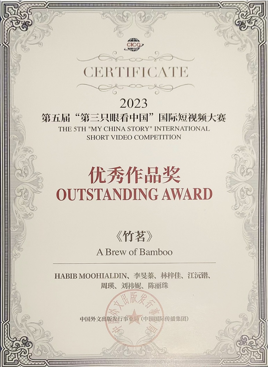 由广工国际交流学院也门籍学生MOOHIALDIN BA HABIB ALI ISMAIL(碧海)和肇庆学院学生林梓佳、李旻蓁等人共同创作的影片《竹茗》在2023年第五届“第三只眼看中国”国际短视频大赛中脱颖而出,荣获优秀作品奖。