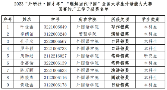 广工学子在2023“外研社·国才杯”“理解当代中国”全国大学生外语能力大赛国赛获2银7铜