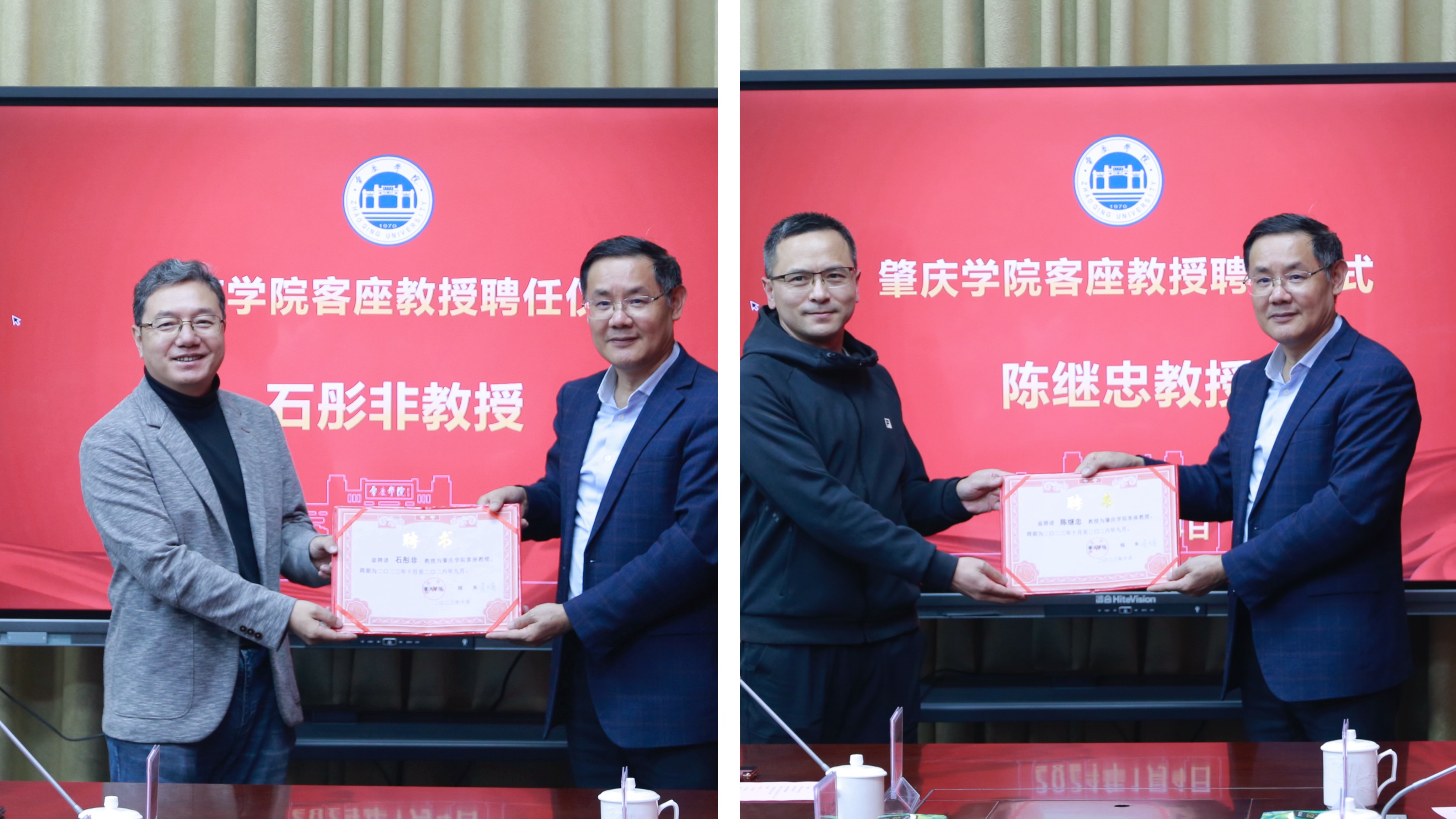 吴业春为广工轻工化工学院石彤非教授、陈继忠教授颁发客座教授聘书,并合影留念。
