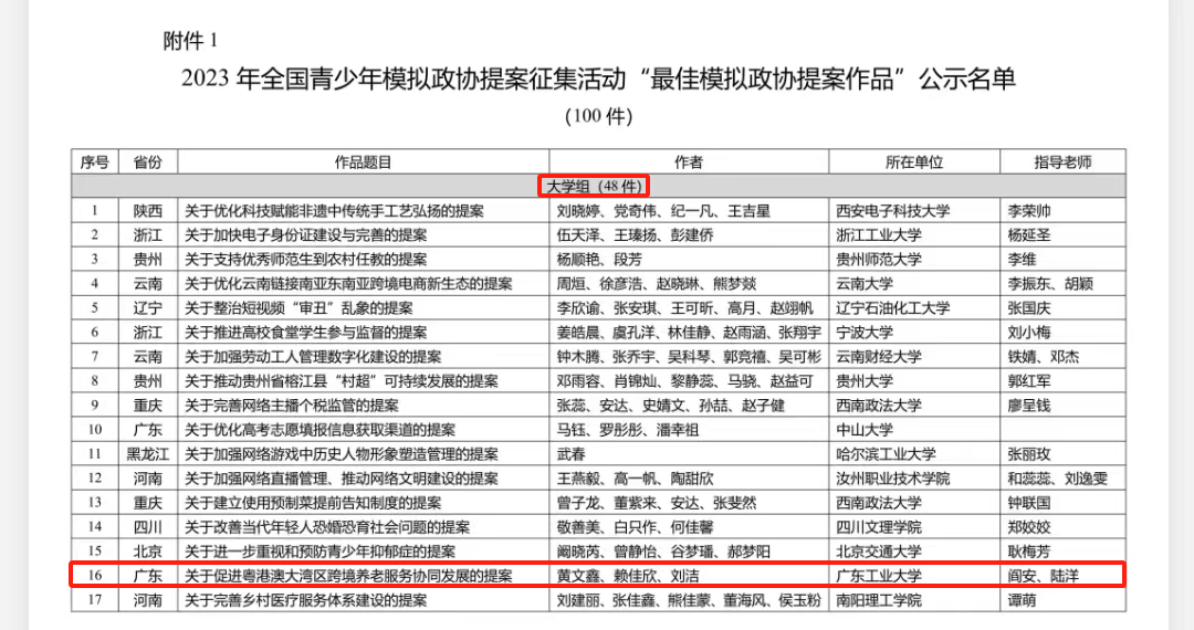 近日,共青团中央权益部公布了2023年全国青少年模拟政协提案征集活动评审结果,学校法学院学子黄文鑫、赖佳欣、刘洁的提案作品《关于促进粤港澳大湾区跨境养老服务协同发展的提案》(指导老师:阎安、陆洋)从全国57.8万余件提案作品中脱颖而出,荣获全国“最佳模拟政协提案作品”奖(大学组)。全国仅有48件提案作品获得此荣誉,其中4件来自广东省高校,分别为万搏网页_万搏(中国)、中山大学、华南理工大学、南方科技大学。