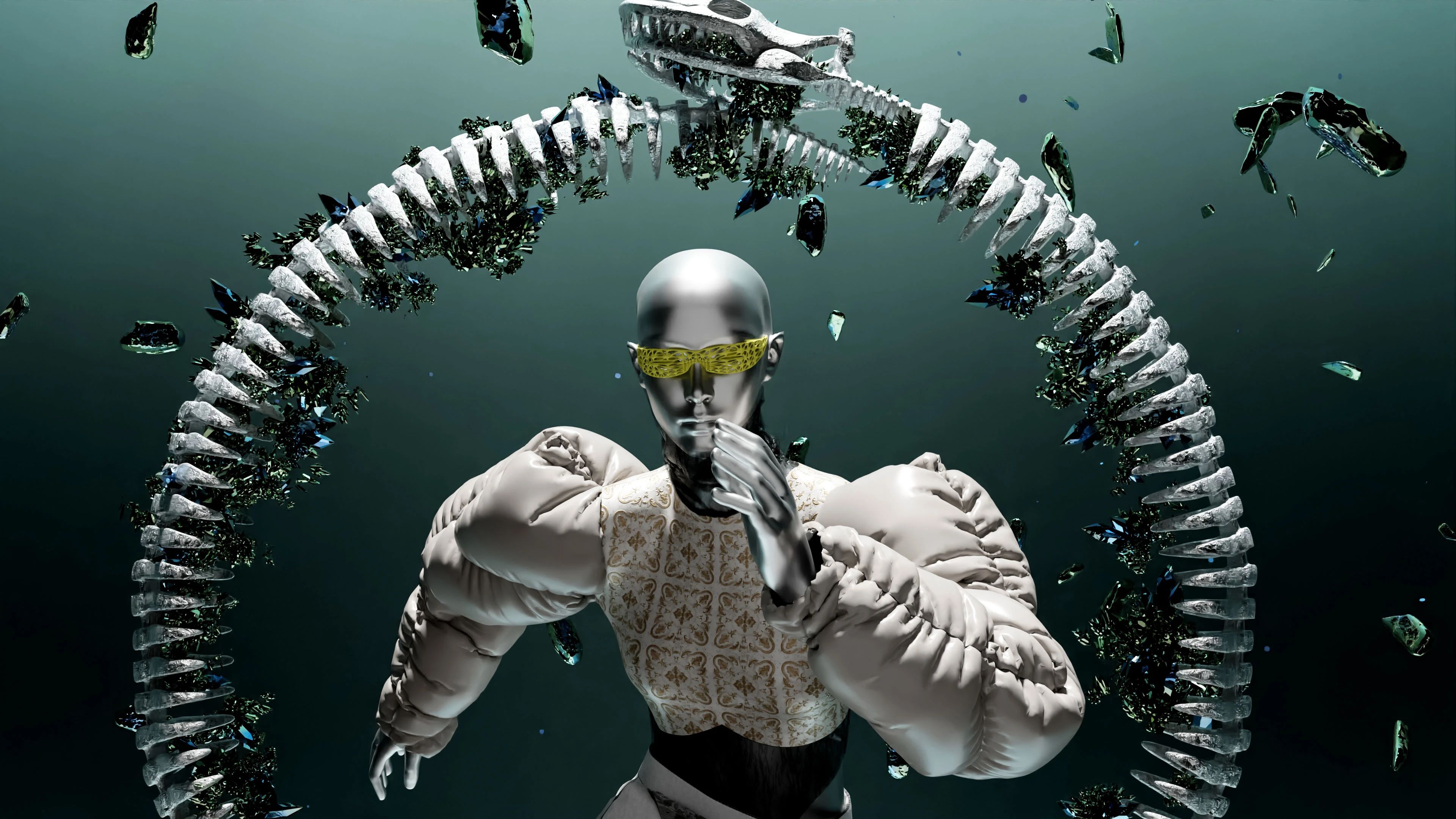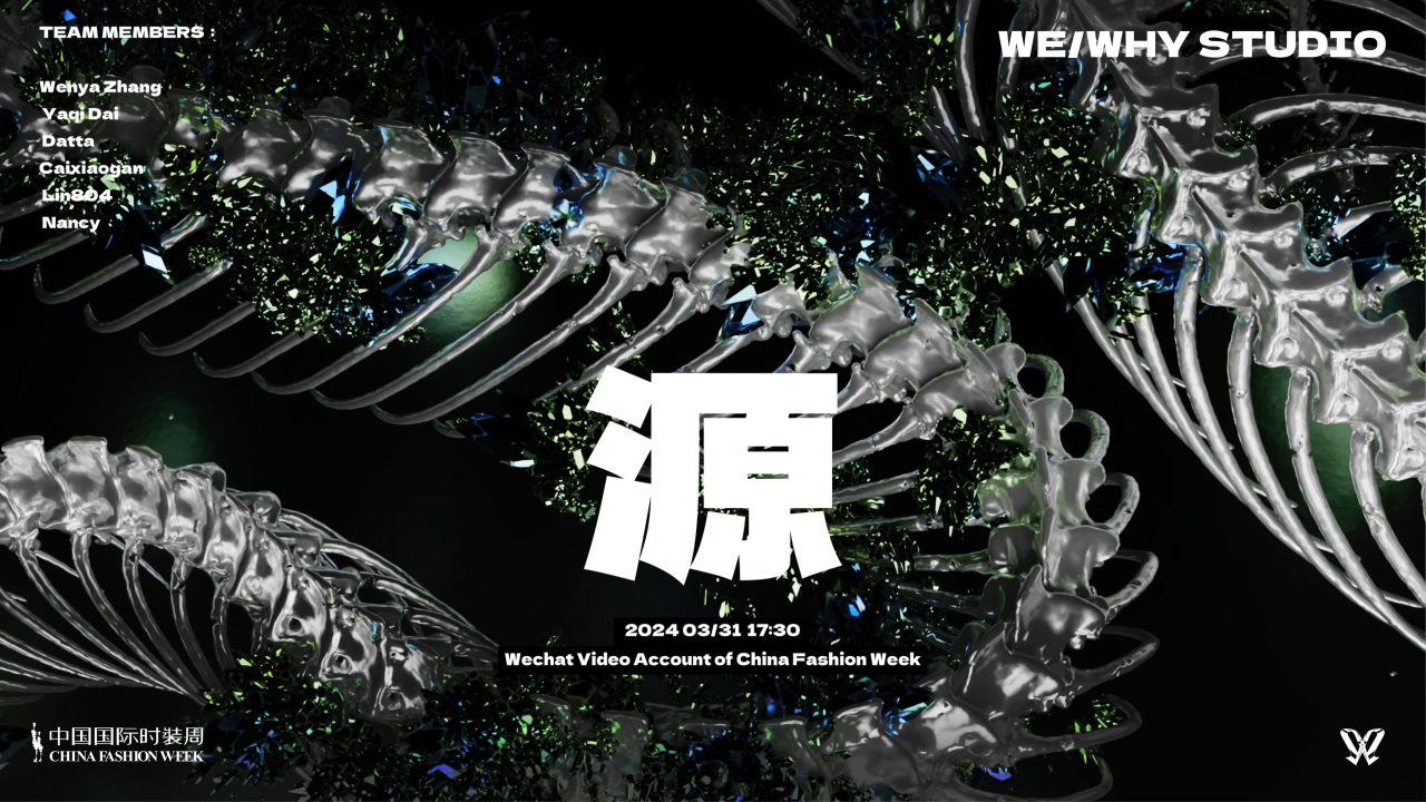 本季的灵感故事脱胎于我国传统哲学思想——道家思想。道家思想中,对于“源”的概念有“自然源一,应乎万物为三,万物作复,由乎五行,周流六虚,同归宗一”的诠释。翻译为白话文后大意为:自然从“一”发源,繁衍出“三”(即万物)的概念,万物之间的相生相克的关系推演出“五行”的概念,万物以这样的关系存在于“六虚”(即宇宙天地之间),万物在经历宇宙天地复杂的相生相克过程后又回归于原点。“五行”实际上是不同事物之间的相互关系,由五种关系衍生出来的五行元素的概念,因此本季五套服装分别解构了“金、木、水、火、土”五种自然元素的元素特性来进行实验性演绎,旨在表达传统道家思想在未来服装中以何种形式体现的思考:以科技手段为工具,以“五行”元素的现实体验为灵感,表现中国传统道家哲学的核心概念。
