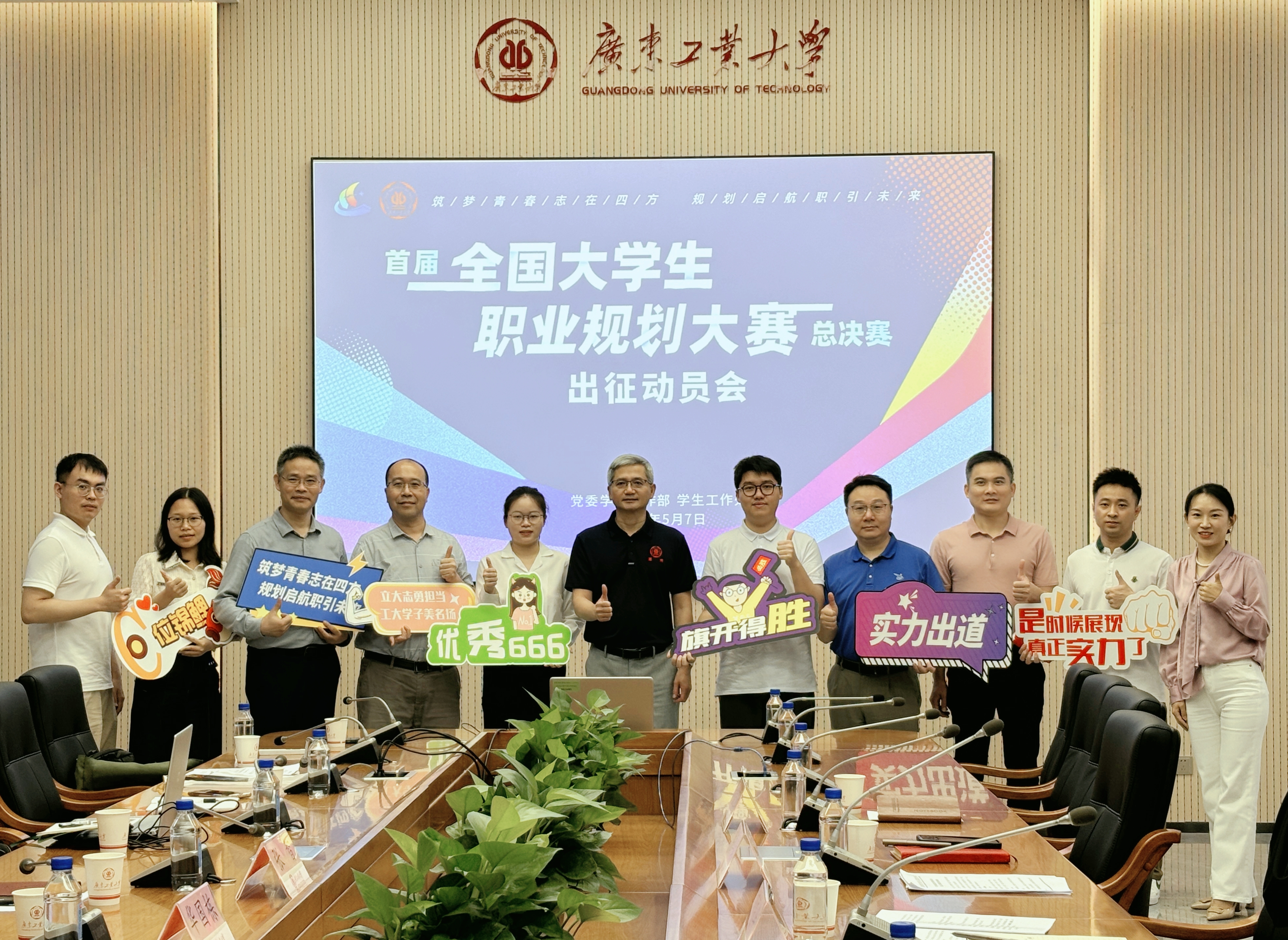 比赛前夕,学校于5月7日召开首届全国大学生职业规划大赛全国总决赛出征动员会。学校党委副书记陈卓武出席会议,他赞许参赛选手在选题陈述方面充分与乡村振兴、科技热点相结合,体现出个人的职业梦想融入国家和社会需求的远大志向,鼓励选手全情投入、奋力拼搏,在国赛的舞台上充分展现出广工学子勇于攀撑、朝气蓬勃的精神风貌,为校争光!