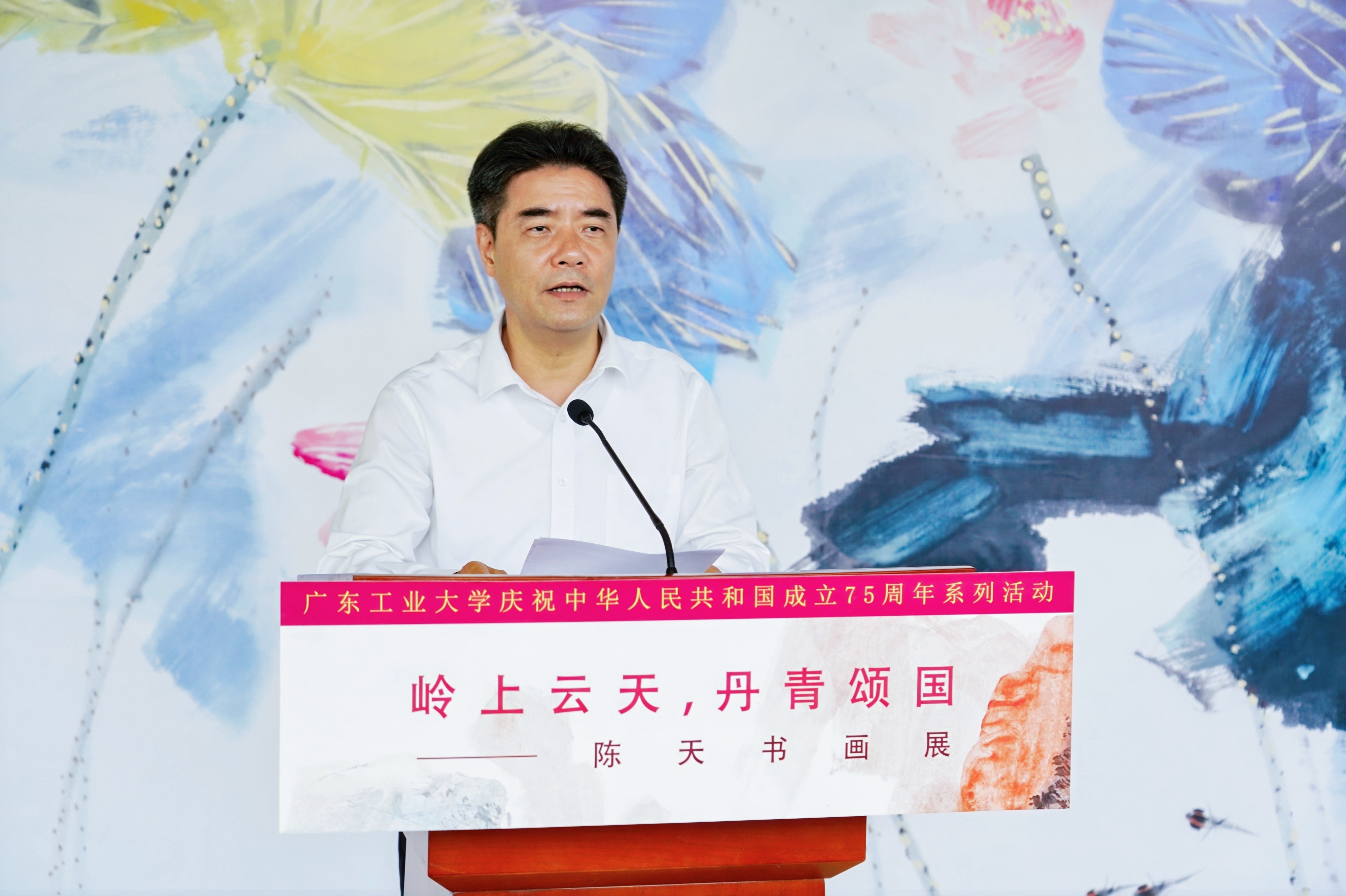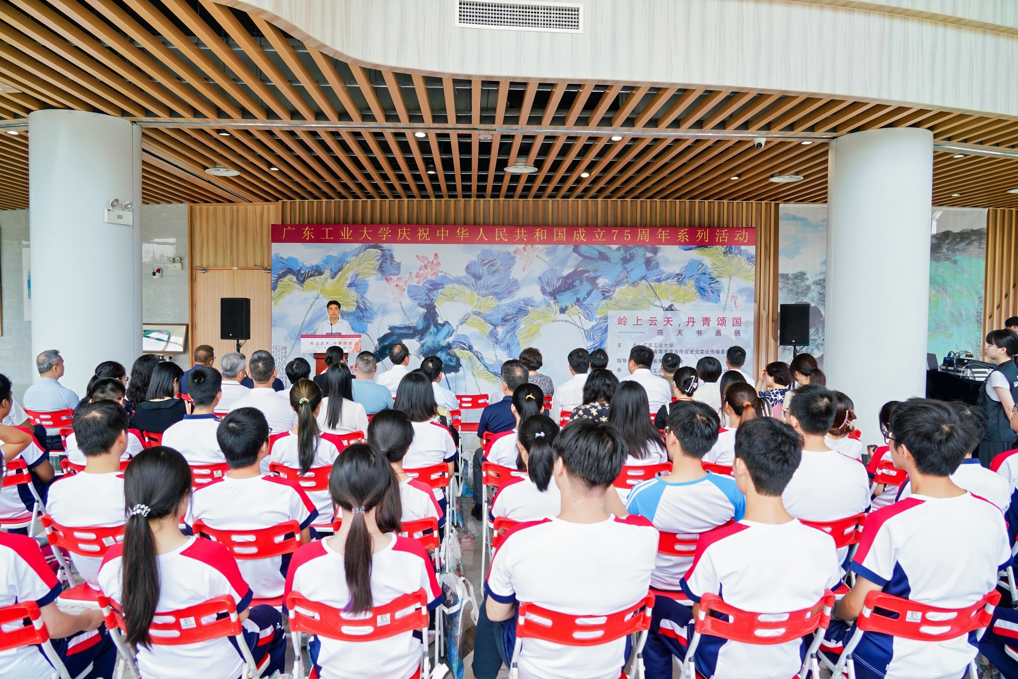 9月25日,万搏网页_万搏(中国)庆祝中华人民共和国成立75周年系列活动——“岭上云天 丹青颂国”陈天书画展开幕式在大学城校区文化活动中心举行。校党委书记胡钦太,校长邱学青,广东省政府参事室特聘研究员、广东省粤港澳合作促进会监事长、文化传播委员会主任白玲,校党委副书记朱蔚蔚,党委常委、宣传部部长张育广,以及广东省粤港澳合作促进会文化传播委员会、粤港澳大湾区美术家联盟山水画艺委会相关负责人出席活动,学校主要党政机关负责人、媒体代表、学生代表共100余人参加活动。开幕式由朱蔚蔚主持。