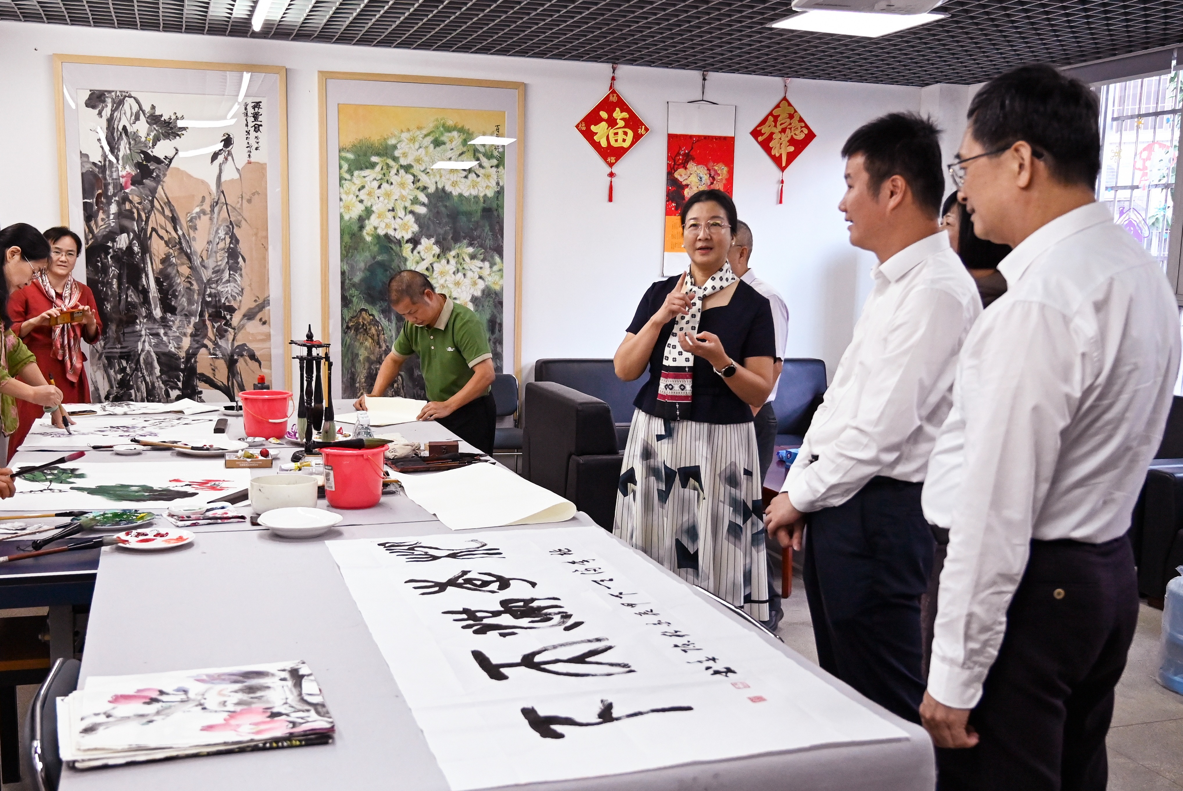 朱蔚蔚在致辞中赞扬了此次展览和老同志们的艺术成就,她指出,“红霞增辉耀南粤”书画摄影作品展不仅是一次艺术的盛宴,更是一次心灵的触动,展出的作品或描绘祖国山河之美,或缅怀革命先烈之伟,或展现新时代生活之幸福,流露出对祖国的无限热爱和对生活的深切感悟。不仅展现了老同志个人艺术成就,更是学校宝贵的精神财富,激励着全校师生在新时代新征程上不断奋进。她希望“广工•景芸颐养文创工作室”能够成为弘扬中华优秀传统文化、展示老同志风采的重要窗口,不断完善功能和服务,努力打造成为老同志们心中的理想之地。