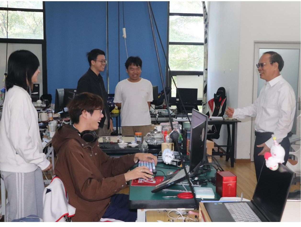 会前,邱学青到工大创谷调研,了解各功能区域使用成效,与创享社、创享创新班-埃安班、粤港机器人联合学院等团队学生亲切交流。