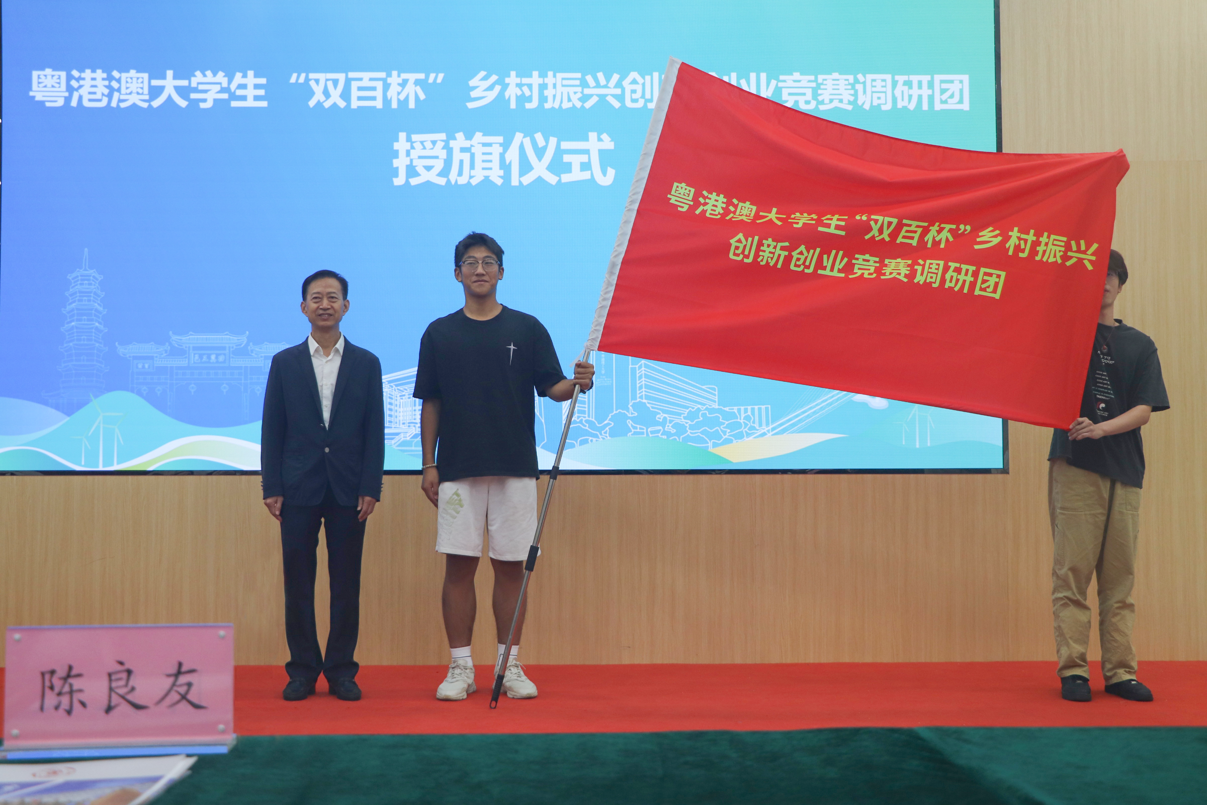 陈良友代表学校向参加本次调研活动的粤港澳三地学生寄语,一是希望同学们充分发挥专业特长和团队协作精神,一起深入基层、深入群众、深入实践,进一步了解广东的历史文化、村情村貌、风土人情,并结合政府、企业发榜要求提出切实可行的建议和措施;二是希望同学们在调研中能够到乡镇基层一线去,到田间地头去,到群众家里去,真正了解基层情况和需求;三是希望同学们善于观察思考、发现问题,勇于创新创造,把所学知识应用到工作实践中,把论文写在祖国大地上,为推动乡村振兴和农业农村现代化建设贡献青春力量。仪式上,陈良友为调研团授旗。