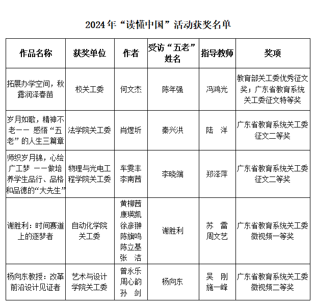 其中,一项作品成功入选教育部关工委的优秀征文名单,实现了征文类作品入选教育部关工委优秀征文零的突破;在省教育系统关工委的征文作品评审中,学校荣获特等奖1项、二等奖2项;在微视频作品评审中,获得一等奖1项、二等奖1项。此外,学校还荣获了教育部关工委2024年“读懂中国”活动表扬单位称号以及广东省2024年“读懂中国”活动优秀组织奖。
