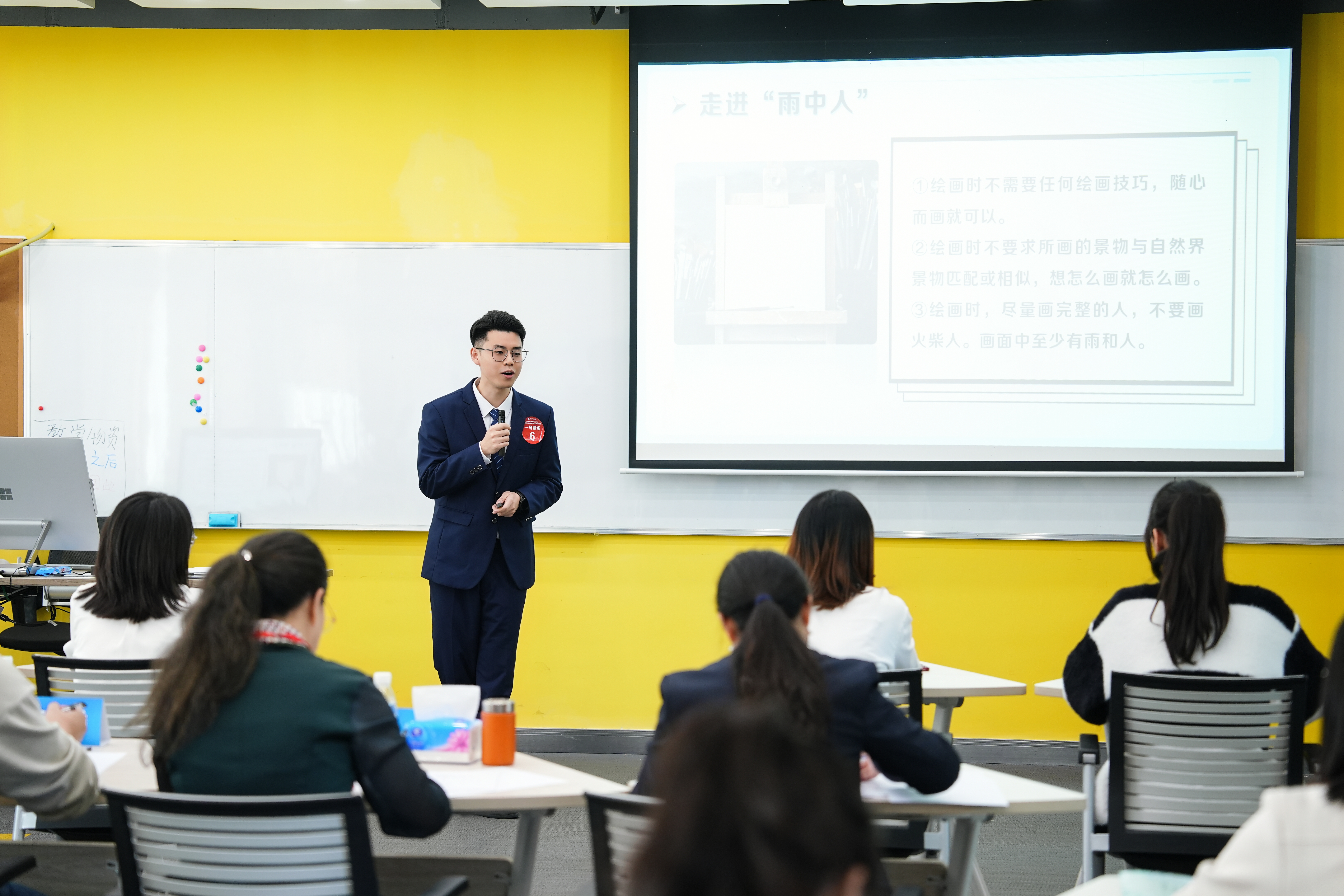 黄祺锐在决赛中以“大学生活的挫折与压力管理”为主题进行授课。课程从“走进雨中人”活动引入,让学生分享挫折和压力的情景,探讨缓解压力小妙招,最后运用绘画给予压力中的“雨中人”支持,增加心理弹性,从挫折中成长。