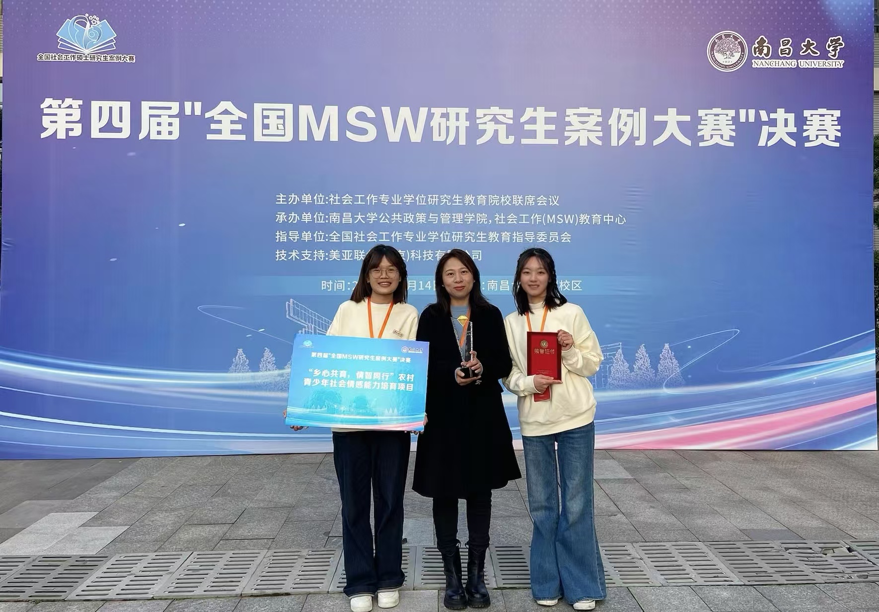 近日,第四届“全国MSW研究生案例大赛”决赛在南昌大学圆满落幕,学校法学院社会工作系梁露尹老师指导,范静婷、郭雪敏、黄桢、陈欣团队申报的《“乡心共育,情智同行”农村青少年社会情感能力培育项目》首次挺进全国40强并晋级决赛,最终凭借卓越表现斩获本届大赛特等奖,梁露尹老师荣膺优秀指导老师奖。由梁露尹老师指导,梁桃花、谢燕荣、谢佳耘、虢云、赖政梼团队申报的《“家校润心,成长同行”——农村中学校家社协同育人项目》和由车海波老师指导,赖俐丽、李景丽、车晶晶、黄颖、武玉婷团队申报的《“互联网+”社会工作助力D镇青少年性教育项目》均成功入围全国百强案例。