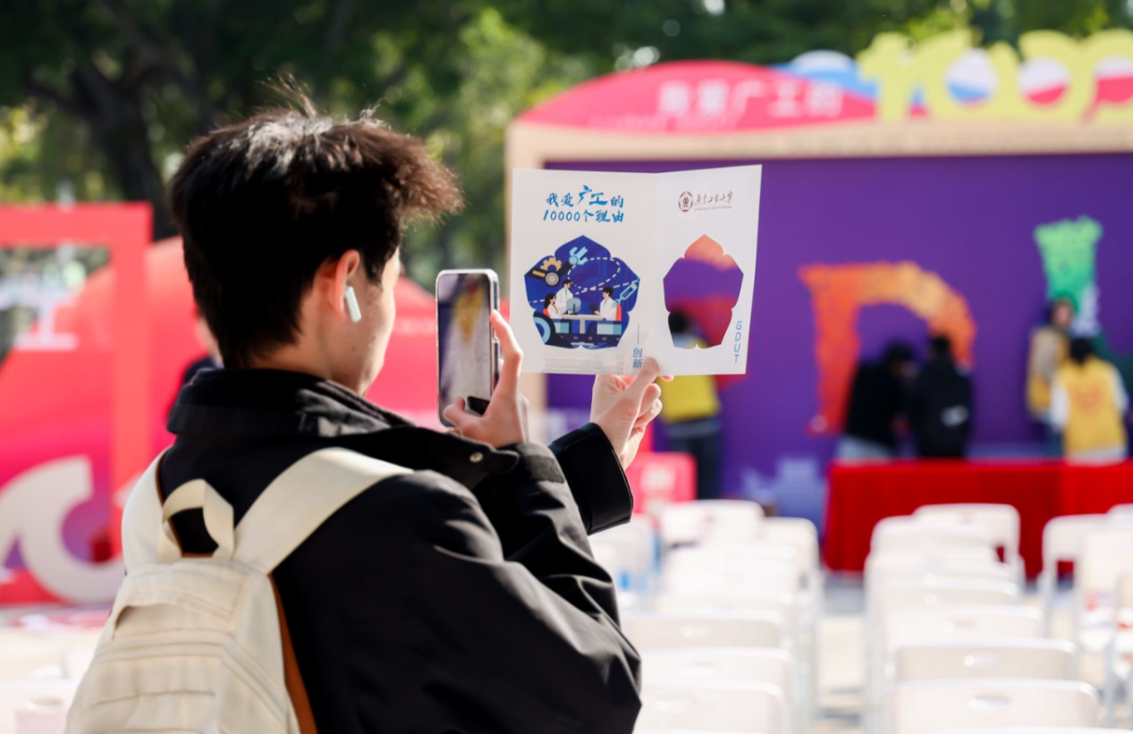 活动上,首次发布由2023级设计学硕士研究生金煜利用AI创作的活动主题曲《我爱广工的10000个理由》,由艺术与设计学院声歌队现场演绎。歌曲轻快悦耳,引起全场共鸣,备受好评。现场还设有五个特色环节:知校·情深叙怀:“我和广工的故事”视频共创;绘校·聚力添彩:“我为GDUT添新彩”彩绘共创;爱校·心心相印:“I ❤ GDUT”文创共创;荣校·光影芳华:“我与广工合个影”照片共创;兴校·攀撑永续:校训主题系列文创产品兑换。热情的广工师生纷纷以校训为引,畅谈“我与广工的故事”,讲述“我爱广工的理由”。活动主背景由现场观众、路过学生和志愿者共创完成,现场还有文创共创环保袋、明信片、卡包、钥匙链等校训主题创意文创派发,各摊位前人潮涌动,同学们纷纷用双手创作出独属于广工记忆的青春文创。