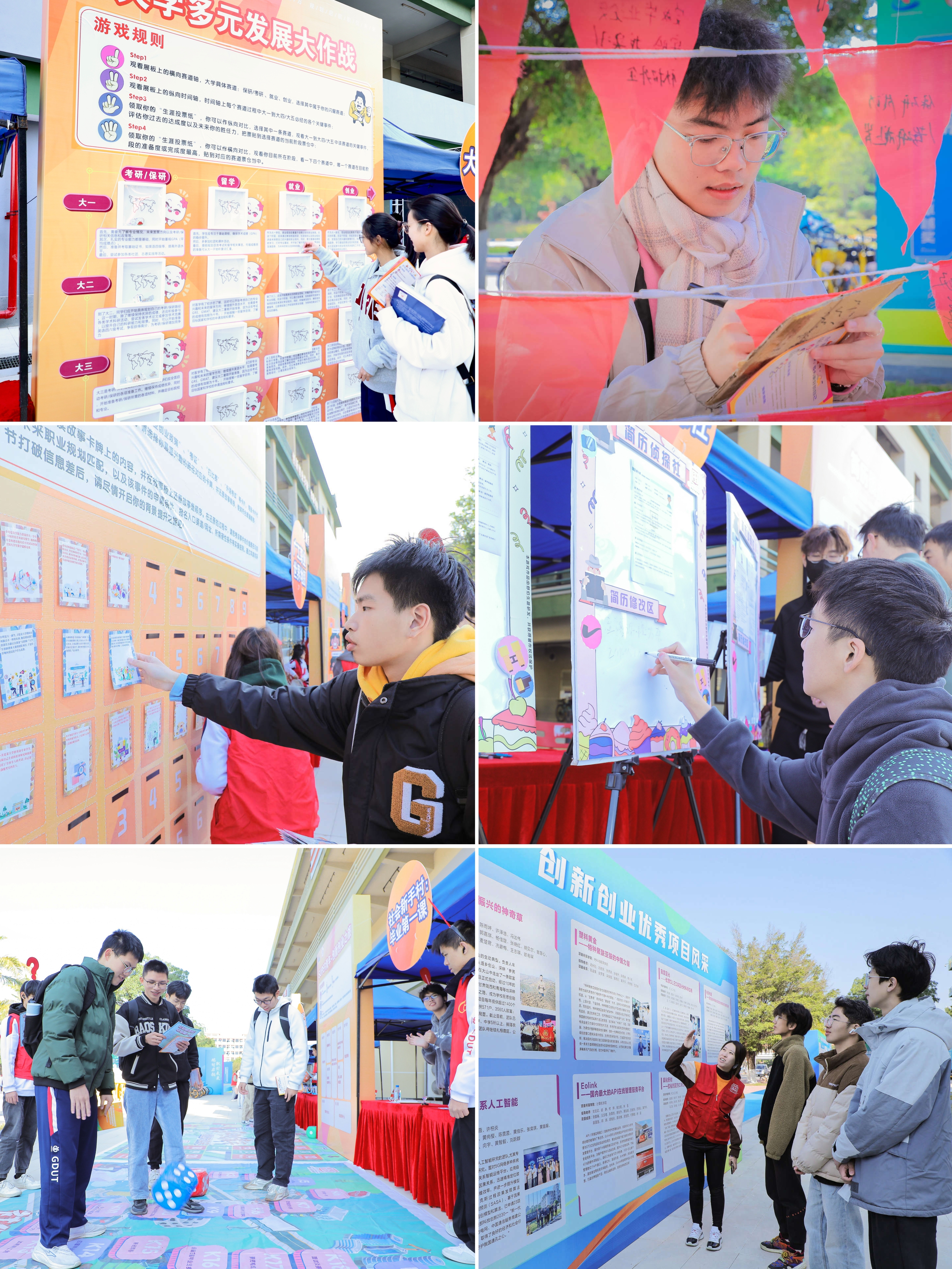 当日,学校在教五、教六校道举行生涯体验嘉年华暨就业创业e站开放日活动。活动采用互动闯关形式推广生涯规划知识,现场设置咨询服务区、闯关项目区、风采展示区,包括“大学多元发展大作战”“我的职业地图”“政策故事牌排排看”“简历侦探社”“面试大挑战”“共筑生涯房”等14个体验闯关项目,创新创业优秀项目展,基层就业人物风采展等。学生在闯关大本营领取个人生涯发展手册,选定自身职业价值取向,写下个人职业目标,通过一系列生涯互动体验游戏,最终画下自己的生涯彩虹图,形成独一无二的生涯发展报告,为生涯规划赋能助力。2000余名学生在体验中感受生涯规划的魅力、在互动中汲取朋辈职业发展正能量、在研读中领会政策支持,乐在其中、学在其中,在欢声笑语中满载而归。