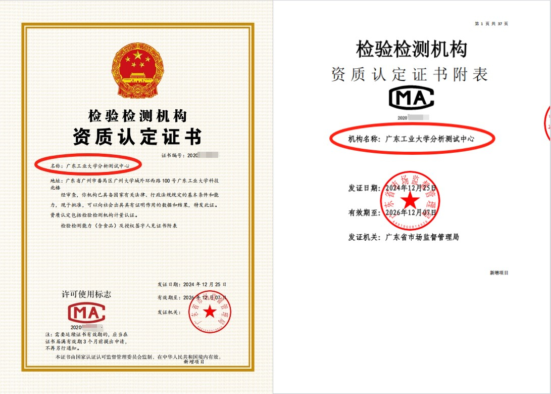 12月25日,经广东省市场监督管理局行政许可,分析测试中心顺利获得新的CMA证书及能力附表,成为目前学校唯一具有CMA资质的检验检测机构,可在其能力附表范围内出具带有CMA标识的检测报告。