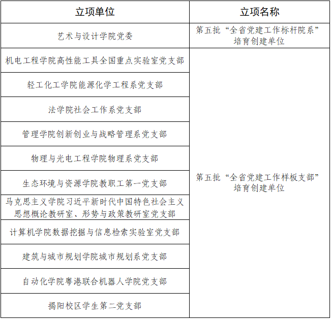 近日,从省委教育工委有关通知获悉,广工在全省第五批新时代高校党建示范创建和质量创优工作中获12个立项,其中“全省党建工作标杆院系”培育创建单位1个,“全省党建工作样板支部”培育创建单位11个。