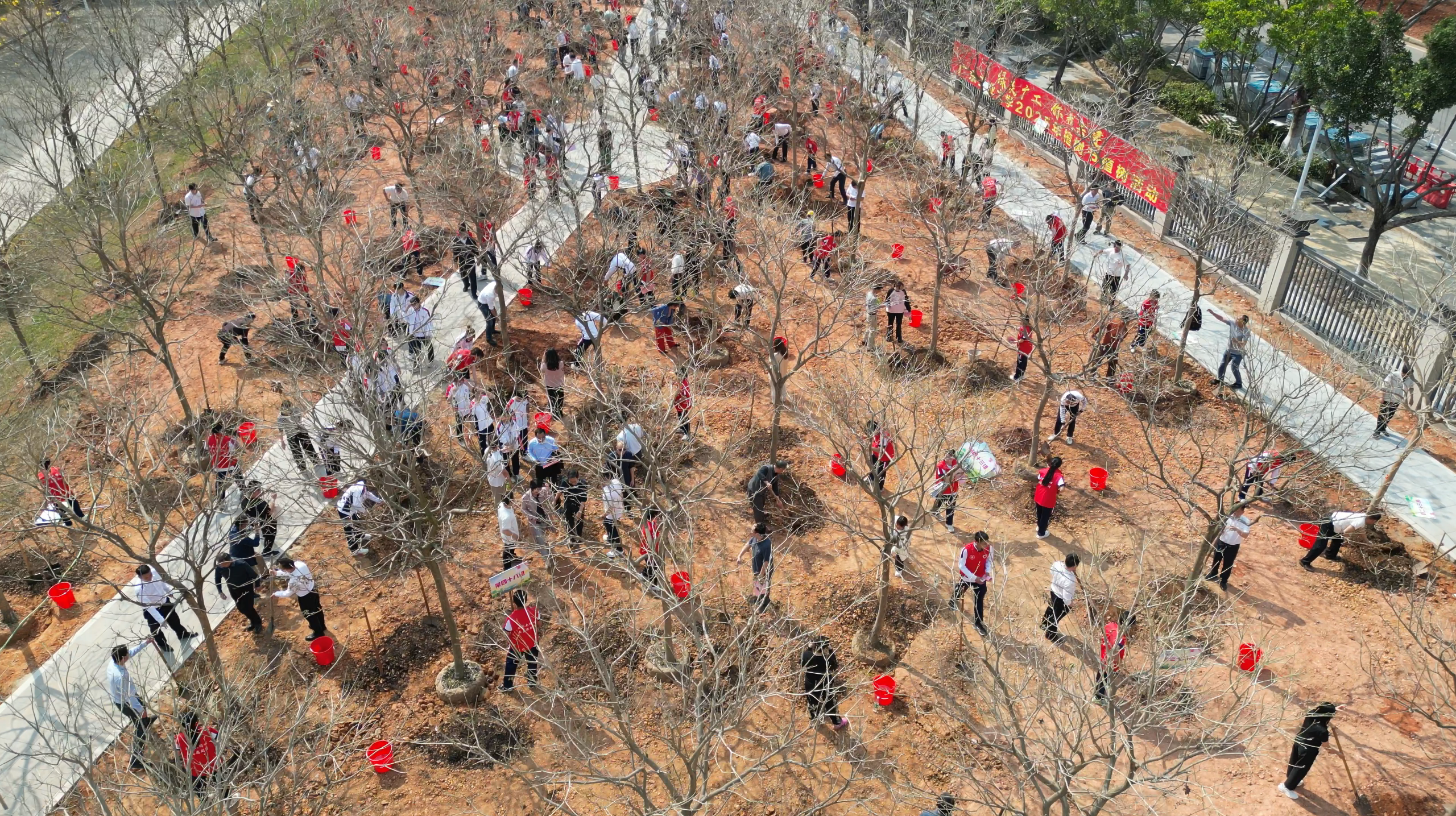 参加劳动的师生一起扶苗培土、拎桶浇水,气氛热烈。“这是一堂生动的劳动教育课。我们种下树苗,就是种下春天的希望。”邱学青一边与同学们植树,一边亲切交流,号召大家在热火朝天的劳动中磨炼意志,了解自然,强化环境保护意识,为美丽中国和绿美广东建设添砖加瓦。