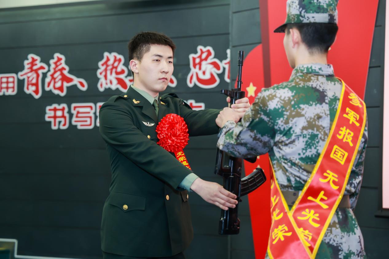 会上还进行了退役老兵宣誓仪式、新老兵交接仪式、新兵向家长献花仪式,学校征兵工作领导小组成员还为退役老兵和入伍新兵颁赠了纪念品。当退伍老兵洪亮宣誓“若有战,召必回!”,当新兵从老兵手中接过钢枪、昂首敬礼,当新兵和家长眼含热泪、紧紧拥抱,忠诚、责任、担当、感恩……展现得淋漓尽致,令现场每个人为之震撼动容。