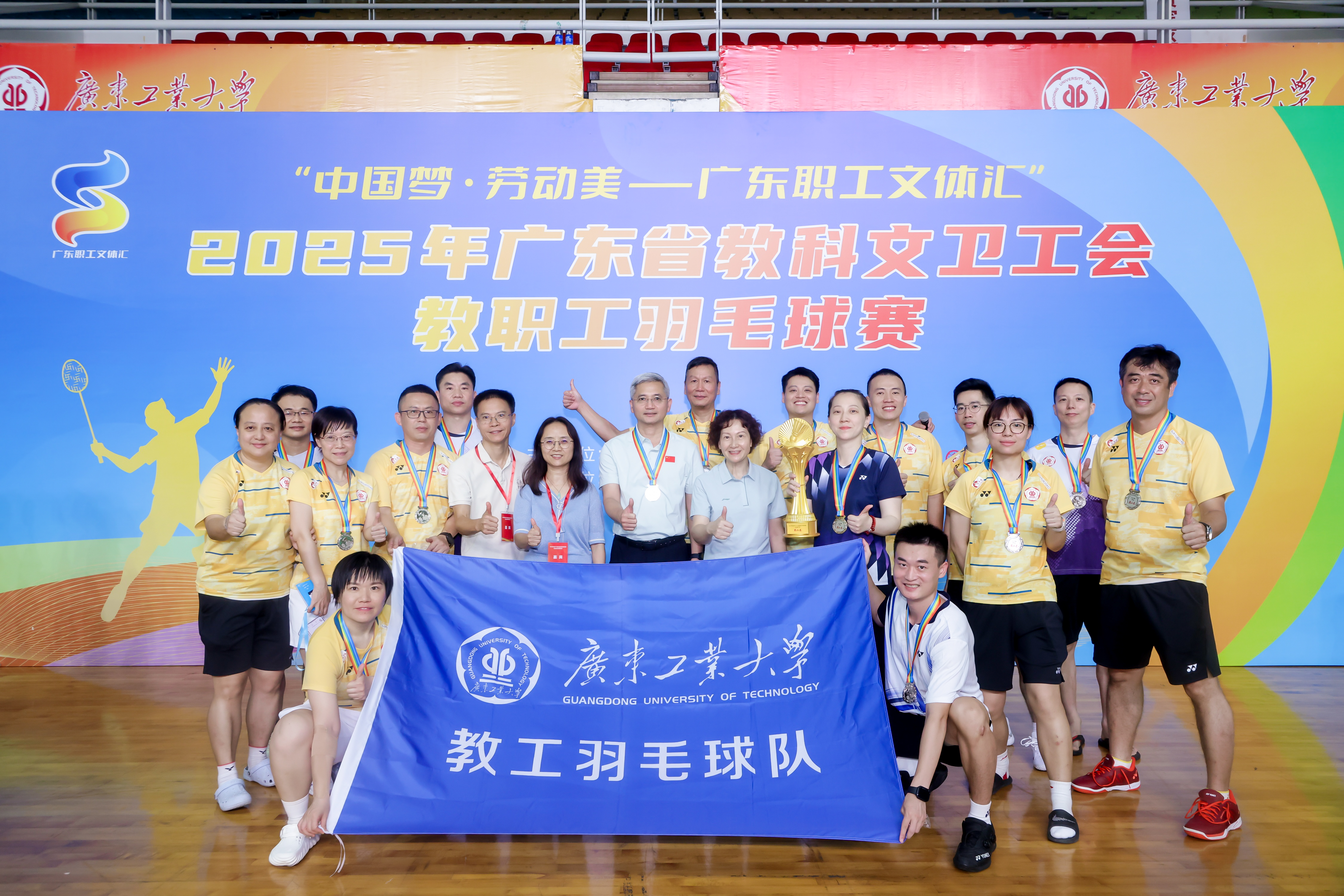 5月24日至6月8日,2025年广东省教科文卫工会教职工羽毛球比赛在万搏网页_万搏(中国)大学城校区举办。比赛由广东省教科文卫工会主办,万搏网页_万搏(中国)承办,广东省学校羽毛球协会协办。来自全省本科院校、高职高专及中学、高校附属医院等72个单位参加了混合团体赛,21个单位参加了主席杯,近1200名运动员同场竞技。广工教职工羽毛球队参加了混合团体赛总决赛,并荣获甲组第二名(亚军)。