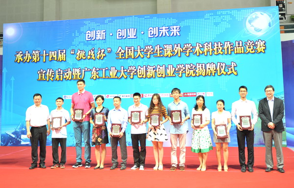 池志雄向“挑战杯”竞赛骑行天下宣传队领队、广州齐天下教育科技有限公司董事长王卫授旗。这标志着竞赛大型骑行宣传活动正式启动。米银俊、张学理为我校创新创业训练基地揭牌。机电工程学院院长郭钟宁、建筑与城市规划学院院长朱雪梅与企业代表为我校首批大学生创新工作室揭牌。
