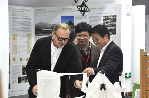 陈新在工作室与正在学习和参与作品设计的同学们亲切交谈,仔细了解学生们的学习情况和科技创新活动,得知学生团队在红点设计奖、东莞杯国际工业设计大赛等国内外重要大赛中获得多项奖项时,对此表示赞赏,勉励同学们继续努力,积极利用现代教育技术条件,取得更好的成绩。在参观国际可持续设计作品展时,他肯定师生团队的跨界设计成果作品,并强调应充分调动学生主动性进行创意设计,并以未来世界“云端”畅想为例,要求学院在教学过程中应整合不同的学科和课程,构建新型的专业课程体系,培养具有多学科知识背景、知识和能力结构合理、基础扎实、素质全面、适应性强的综合性创新人才,提升创新能力。
