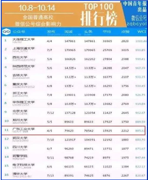 本网讯 10月16日,在中国青年报出品的全国普通高校微信公号排行榜【10.8-10.14】上,我校官微“万搏网页_万搏(中国)”位列榜单第11名。在中国青年报出品的全国普通高校单周文章阅读量排行榜上,学校官微排名第7。