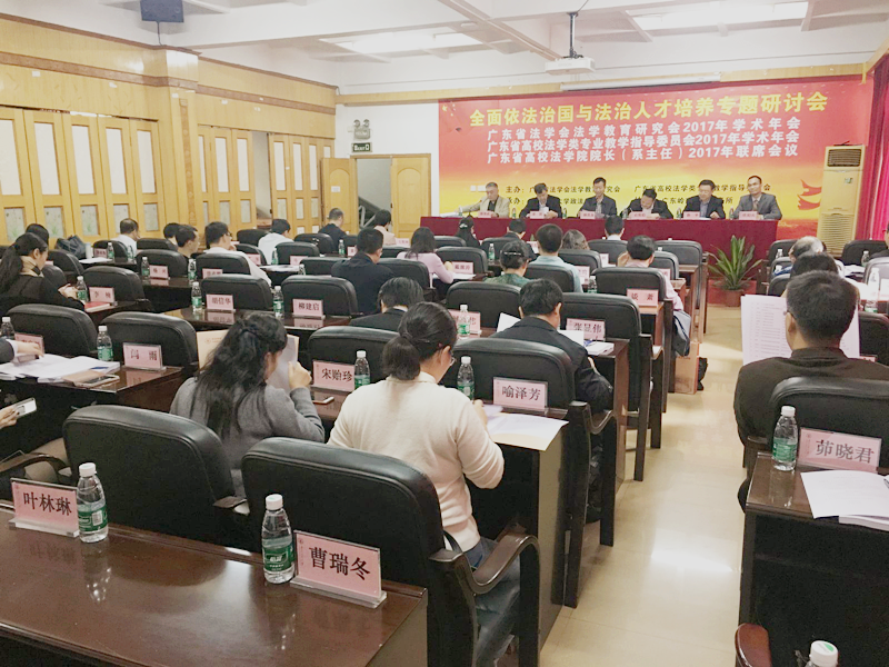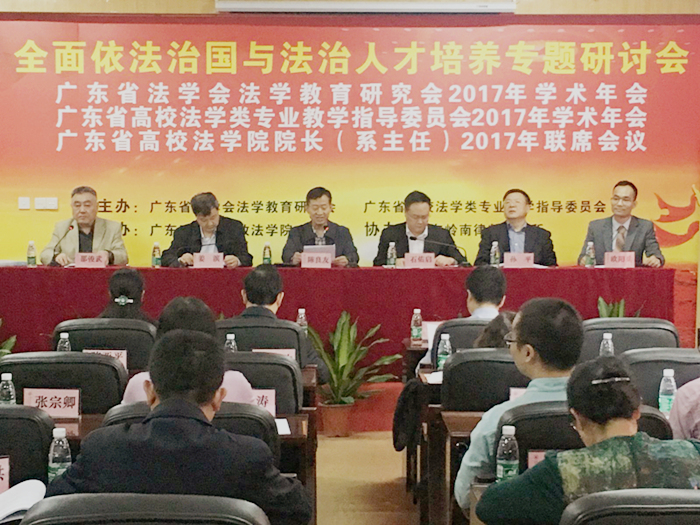 本网讯 11月29日,广东省法学会法学教育研究会、广东省高校法学类专业教学指导委员会、广东省高校法学院院长联席会议暨2017年学术年会在我校东风路校区召开。会议由广东省法学会法学教育研究会、广东省高校法学类专业教学指导委员会主办,我校政法学院承办,广东岭南律师事务所协办。校党委副书记陈良友,广东省法学会专职副会长兼秘书长姜滨,广东省法学会法学教育研究会会长、广东省外语外贸大学党委副书记石佑启,广东省法学会研究部主任郑桂琼,和来自省内27所高校的80余名代表参加了会议。会议开幕式由政法学院院长邵俊武教授主持。
