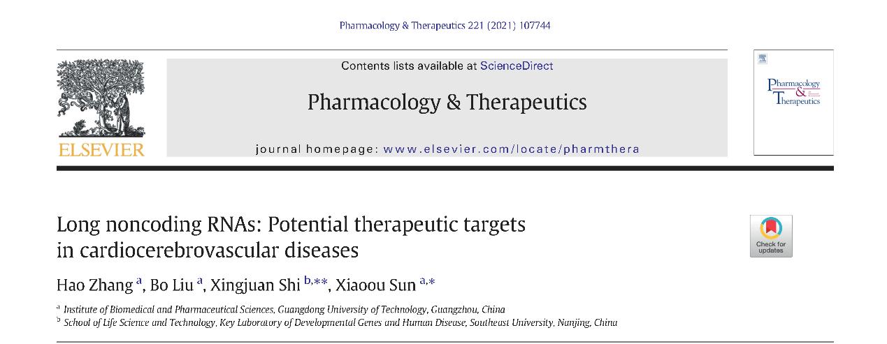 近日,我校生物医药学院孙晓鸥老师在Pharmacology & Therapeutics杂志上发表论文,对长链非编码RNA(Longnon-codingRNA,lncRNA)在心脑血管中的功能进行了系统的总结。论文第一作者系我校生物医药学院出站博士后张昊博士,通讯作者为我校生物医药学院孙晓鸥老师和东南大学青年教师史兴娟。