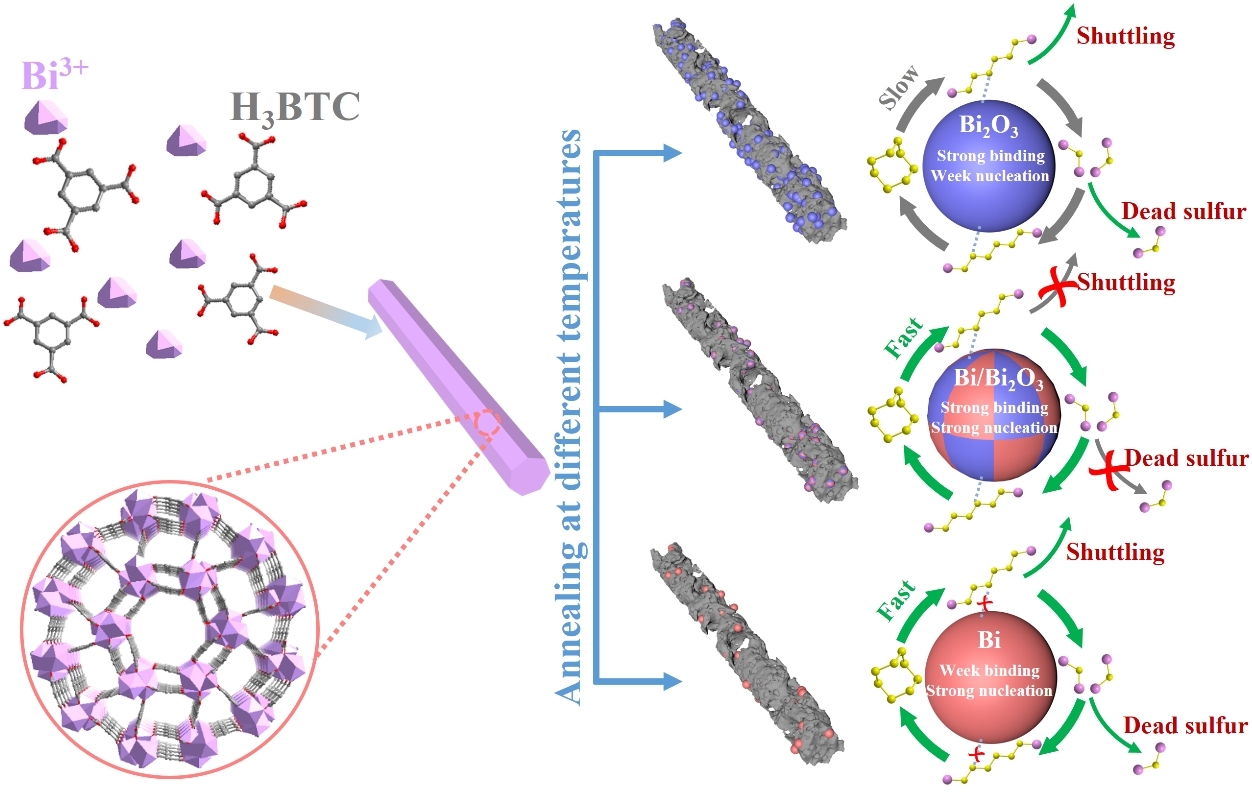 多硫离子的穿梭效应是影响锂硫电池性能的一个重要因素之一。黄少铭教授团队在前期设计和研发了一系列对多硫离子具有物理吸阻隔、化学吸附以及催化转化功能的插层材料,抑制锂硫电池在充放电过程中多硫离子的穿梭效应,提高电池的性能(系列论文发表在Adv.Mater.,Adv. Energy Mater., ACS Nano, Adv. Funct. Mater. J. Mater. Chem. A, ACS Mater. Lett.,NanoRes.等上)。最近,由张琪副教授具体指导的博士研究生肖迎波在金属-有机骨架(MOF)衍生的具有分级结构的硫主体中精心设计了Bi/Bi2O3异质结构(Bi/Bi2O3@C@G),既可用作硫载体,又可促进LiPS的氧化还原反应动力学。结果表明:形成的Bi/Bi2O3异质结构界面处存在大量活性位点。此外,Bi2O3对LiPSs有很强的化学吸附作用,同时Bi提供更好的导电性和更高的氧化还原活性,促进了LiPSs转化过程中的电子转移(图2)。论文发表在ACSNano(2021,15,18363,IF=15.9)上。