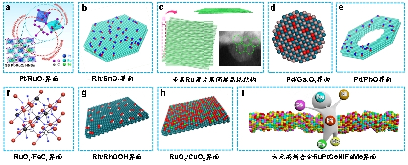 贵金属催化剂在诸多反应中表现出优异的活性,被广泛用于石油化工中的催化炔烃加氢、烷烃脱氢、甲烷转化、二氧化碳加氢等重要反应。然而对于绝大部分催化剂而言都面临着如何权衡活性和选择性的问题。因此开发高活性、高选择性催化剂成为了学术界和工业界共同关注的焦点。针对存在的科学问题和技术瓶颈,徐勇教授开展了催化剂及催化活性中心的设计及可控构筑、活性中心结构调控、以及与催化性能的构效关系等研究,取得了一系列高水平成果。如以铂钌硒(PtRuSe)复合结构为模板,在热处理后得到Pt/RuO2复合催化剂、在二维Rh纳米薄片上构筑了Rh/SnO2界面、以及构建Pd/Ga2O3、Pt/O/C、Pd/PbOx、Rh/RhOOH、Ru/CuO、RuOx/FeOx界面、多层Ru薄片超晶格结构及高熵合金纳米结构等,并系统研究了界面效应对催化剂性能的影响(图1)。系列工作发表在Sci. Adv., Nat. Commun., Adv. Mater., JACS, Angew.Chem.等国际顶级学术期刊上。