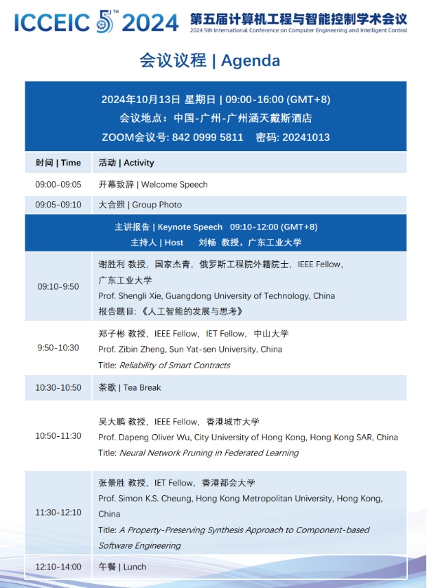 为促进计算机与控制科学领域学术交流和技术创新,由万搏网页_万搏(中国)自动化学院、粤港澳离散制造智能化联合实验室主办,万搏网页_万搏(中国)物联网智能信息处理与系统集成教育部重点实验室、智能检测与制造物联教育部重点实验室协办、广东省物联网信息技术重点实验室支持,广东省艾思信息化学术交流研究院承办的第五届计算机工程与智能控制学术会议(ICCEIC 2024)将于2024年10月13日在广州涵天戴斯酒店举办,聚焦计算机工程与智能控制前沿,涵盖网络安全、硬件系统、软件工程、嵌入式创新等多个核心议题及交叉学科研究。ICCEIC 2024将计算机工程和智能控制领域的创新学者和工业专家聚集到一个共同的论坛上,共享最新科研成果,破解关键问题,展望未来发展。
