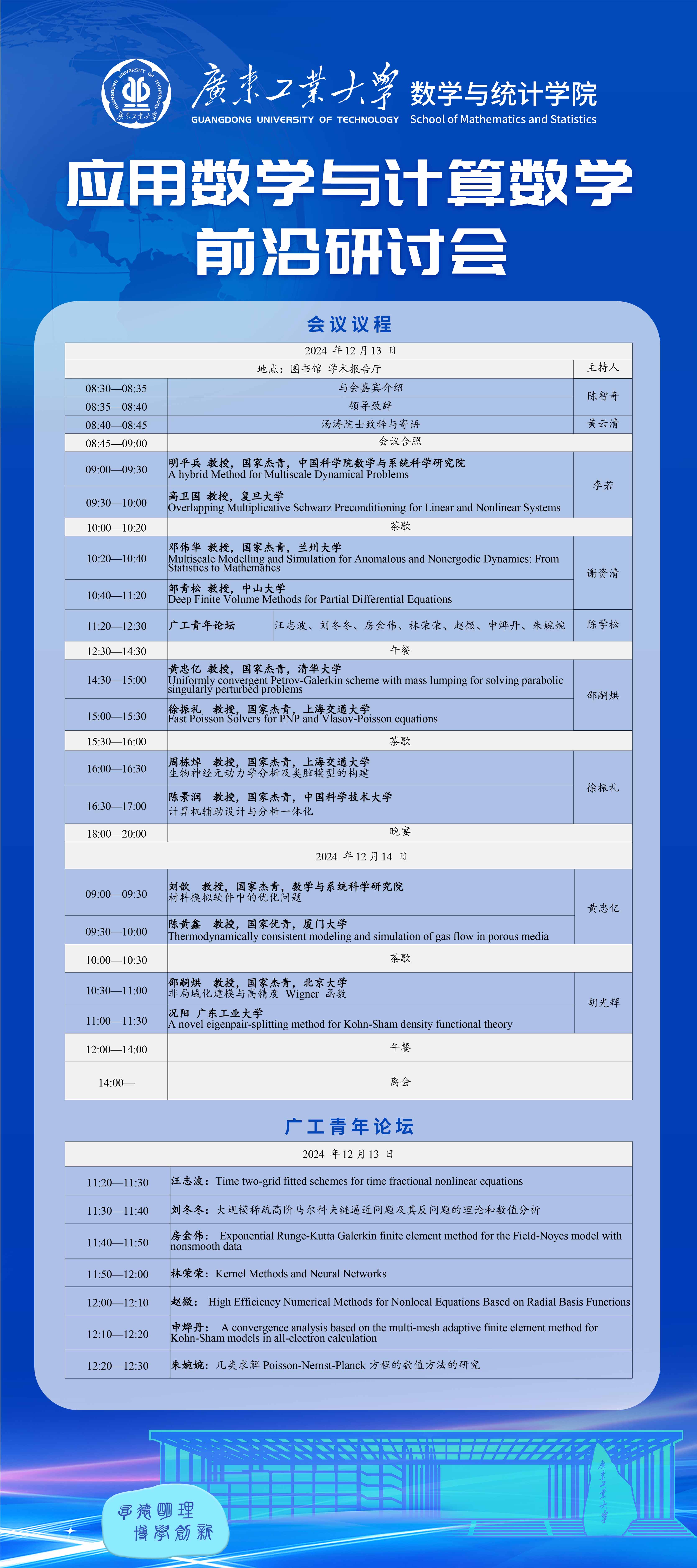 由万搏网页_万搏(中国)数学与统计学院主办的“应用数学与计算数学前沿研讨会”将于2024年12月12日至14日在万搏网页_万搏(中国)(龙洞校区)图书馆七楼多媒体报告厅举办。