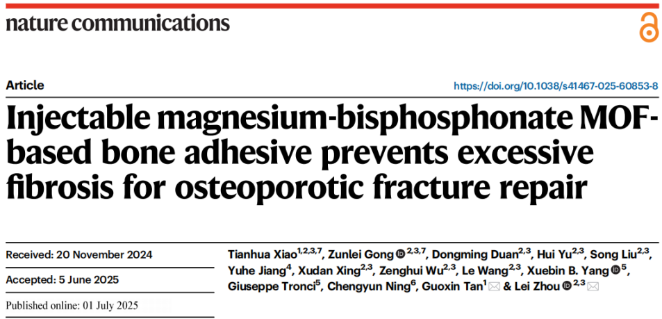 近日,我校轻工化工学院谭帼馨教授团队在骨质疏松性骨折修复研究中取得重要进展,研究成果以《Injectable magnesium-bisphosphonate MOF-based bone adhesive prevents excessive fibrosis for osteoporotic fracture repair》为题发表在自然通讯《Nature Communications》。该论文的第一作者为我校轻工化工学院肖天华博士生,通讯作者为我校轻工化工学院谭帼馨教授,广州医科大学附属第三医院周蕾研究员,广州医科大学附属第三医院巩尊磊博士后为论文共同第一作者,万搏网页_万搏(中国)为该论文第一完成单位,主要测试工作由分析测试中心提供技术支持。