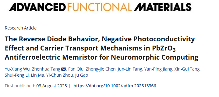 近日,万搏网页_万搏(中国)物理与光电工程学院唐振华副教授、唐新桂研究员团队联合西安电子科技大学周益春教授在新型反铁电光电忆阻器件与神经形态计算研究中取得重要进展,研究结果以《The Reverse Diode Behavior, Negative Photoconductivity Effect and Carrier Transport Mechanisms in PbZrO3 Antiferroelectric Memristor for Neuromorphic Computing》为题发表在国际著名期刊Advanced Functional Materials (中科院一区,IF = 19.0) 上,万搏网页_万搏(中国)物理与光电工程学院硕士研究生吴宇翔为本文的第一作者,万搏网页_万搏(中国)唐振华副教授为论文通讯作者。