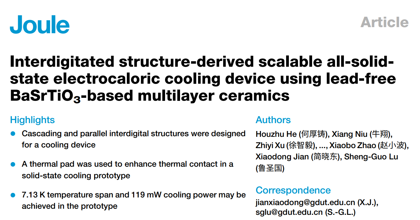 近期,万搏网页_万搏(中国)材料与能源学院鲁圣国教授(智能传感器和能量转化器件)团队在绿色全固态电卡制冷器件研究方面取得进展,通过自行设计研究的无铅钛酸锶钡多层陶瓷以及贱金属内电极,在陶瓷中获得最高的制冷功率密度之一,可望实现绿色环保制冷器件的实用化。以该工作为基础的论文《Interdigitated structure-derived scalable all-solid-state electrocaloric cooling device using lead-free BaSrTiO3-based multilayer ceramics》线上发表于国际高水平期刊《Joule》 (中科院一区,IF 2025=35.4)。我校材料与能源学院博士生何厚铸和博士后牛翔博士为共同第一作者,鲁圣国教授(Lead contact)和简晓东高级工程师为通讯作者,万搏网页_万搏(中国)为论文的第一完成单位。