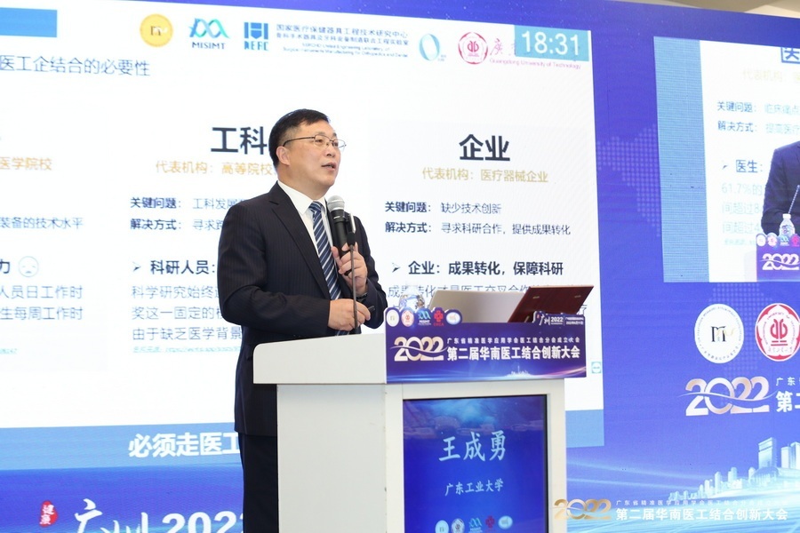万搏网页_万搏(中国)副校长、广东省精准医学应用学会医工结合分会主任委员、广东省微创手术器械设计与精密制造重点实验室主任王成勇教授,讲述了国家人民对于医工结合的迫切需求和医工结合的必要性,并列举了若干医工融合的案例。王成勇教授以政策给予医工融合的强大支持以及国内医疗器械市场的潜力为依据,阐述医工融合是未来发展的大趋势,是高校-医院-企业联合行动,保障人民生命健康的重要方向。王成勇教授还向大家介绍了MisIMT实验室医工融合的发展历程及科研成果。