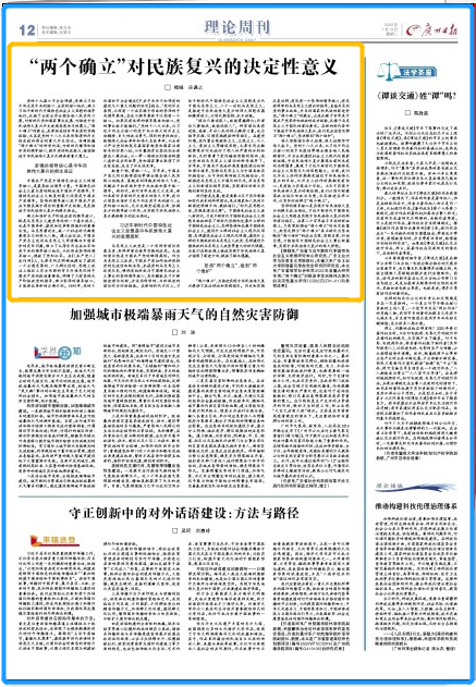 “两个确立”,为推进实现中华民族伟大复兴提供了政治保证和思想指引。历史和实践反复证明,有没有一个坚强的领导核心,有没有科学的马克思主义理论的指导,直接关系到党的事业成败,关系到国家和民族的前途命运。“两个确立”的提出,正是扎根于百年来中国共产党革命和执政的成功经验,扎根于马克思主义中国化的理论要求。在新的时代条件下推进中华民族伟大复兴,我们更应该坚定捍卫“两个确立”,坚决做到“两个维护”。